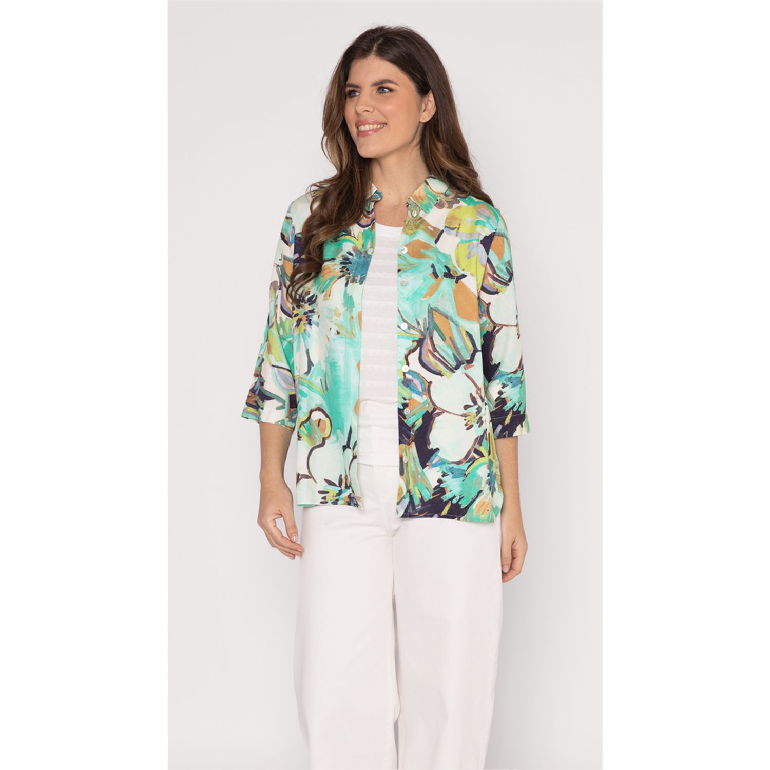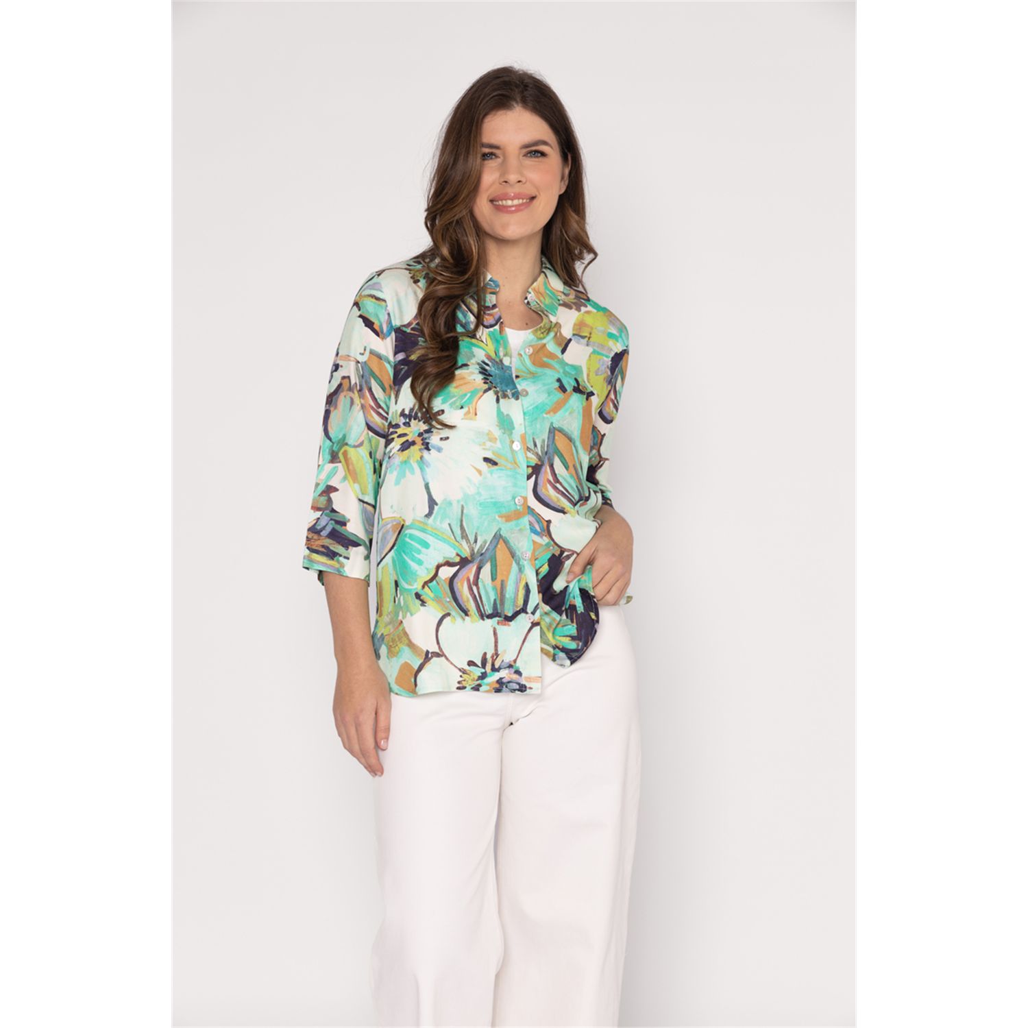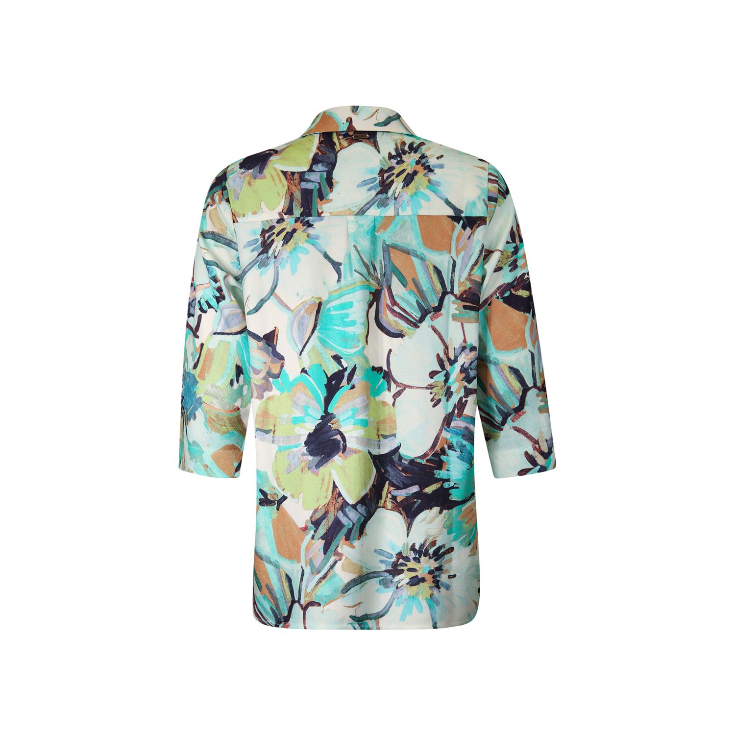 This 100% viscose blouse falls just over the hip. The sleeves can be worn long or folded and secured with a loop. Available in a fresh print that in turn pairs nicely with our uni T-shirts.
