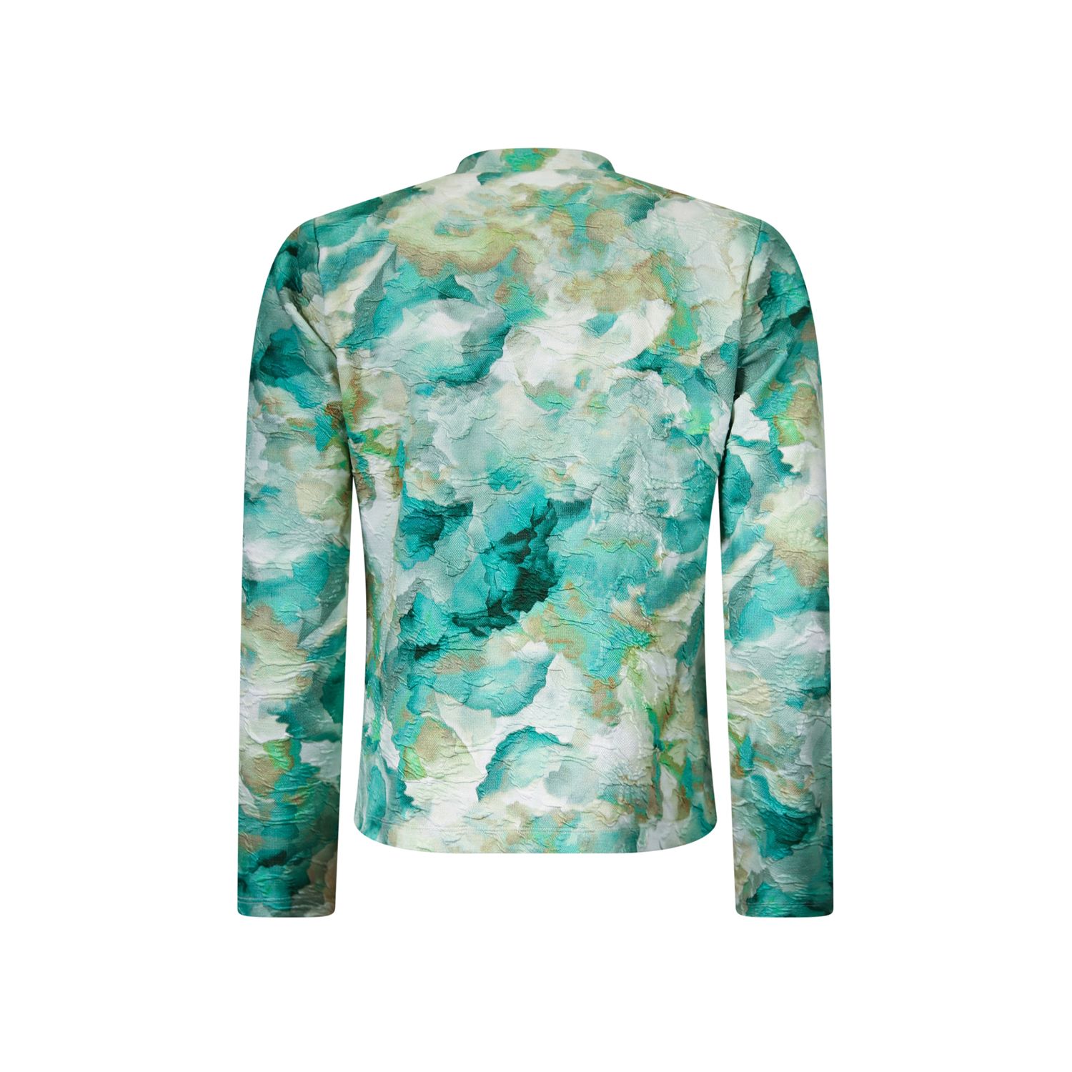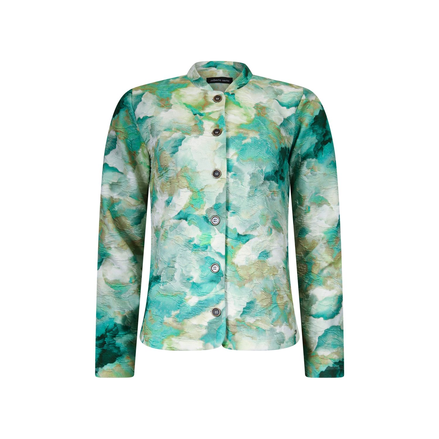 Jacket in a printed textured jacquard fabric with a zipper closure. Short stand-up collar. 2 pockets, slightly fitted.