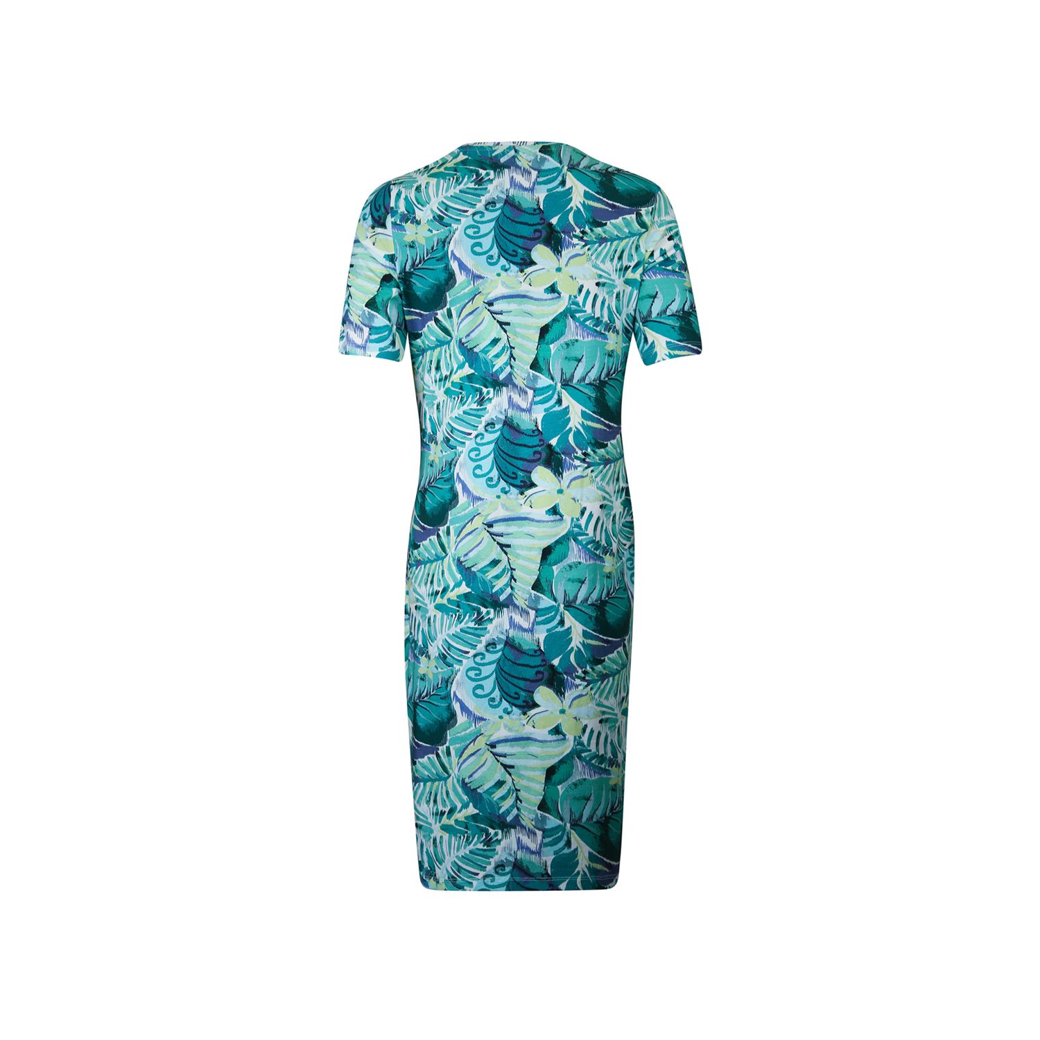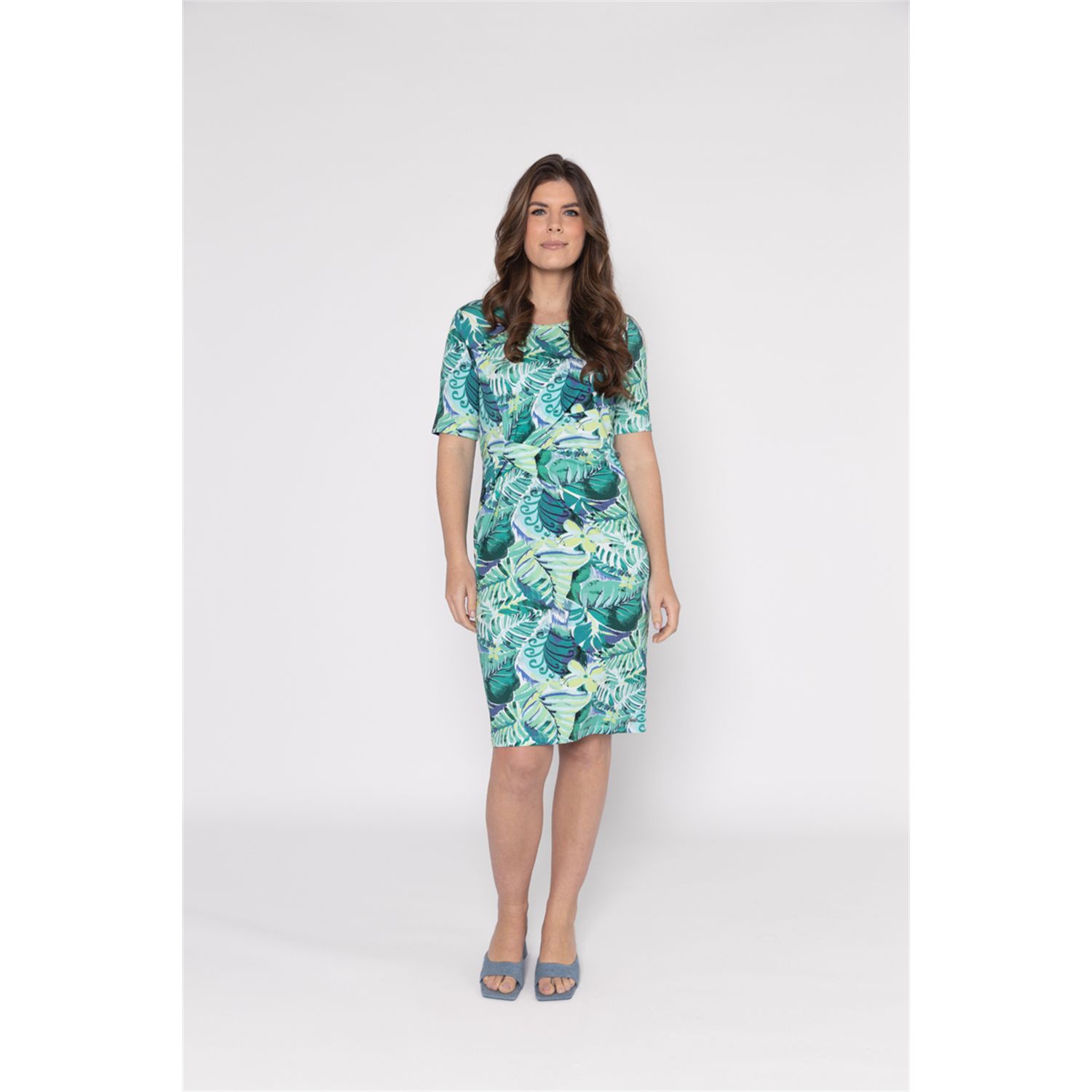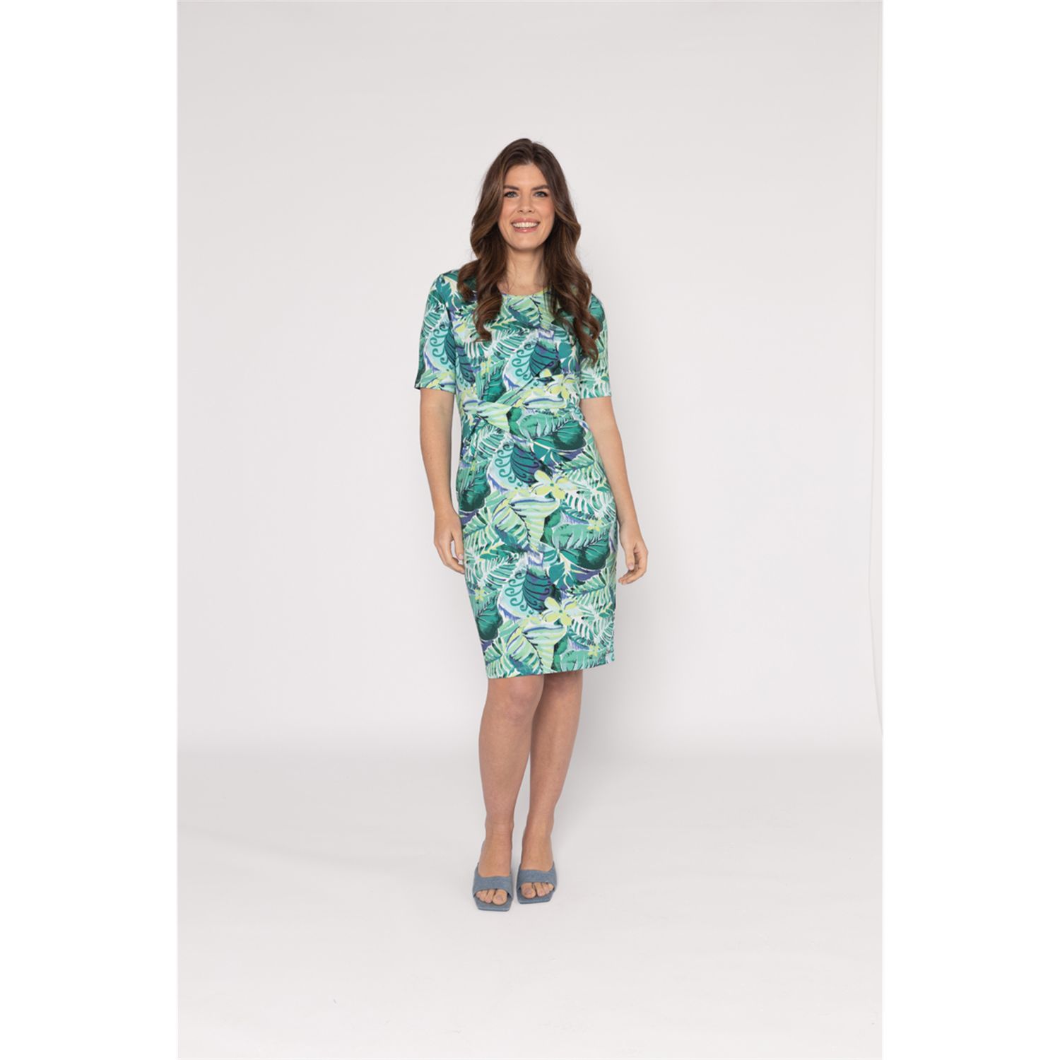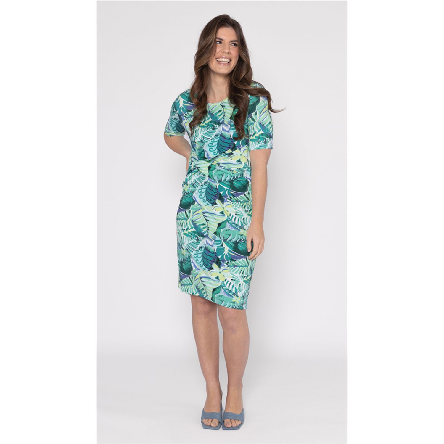 Dress round neck, with short sleeve and beautiful draping on the front. Available in multiple print.