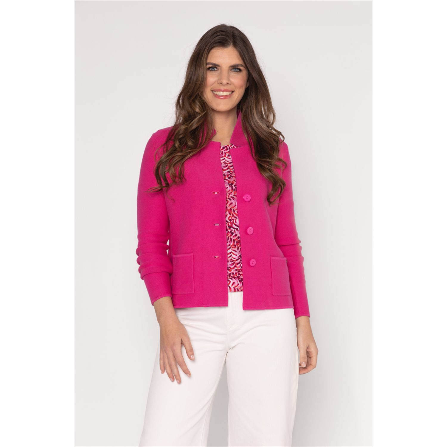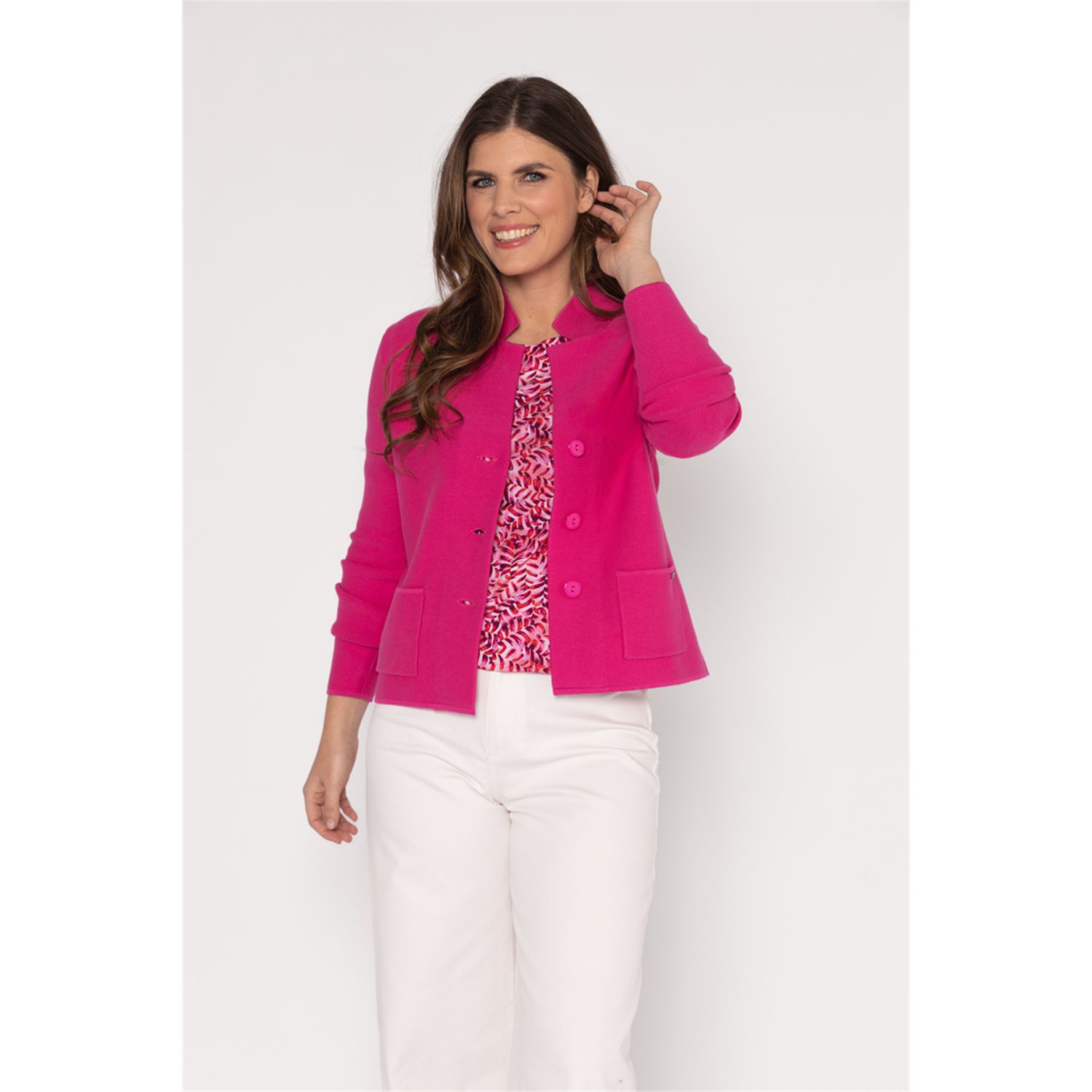 Cardigan jacket in nice firm soft knit with button closure and real pockets. [611143-R935]