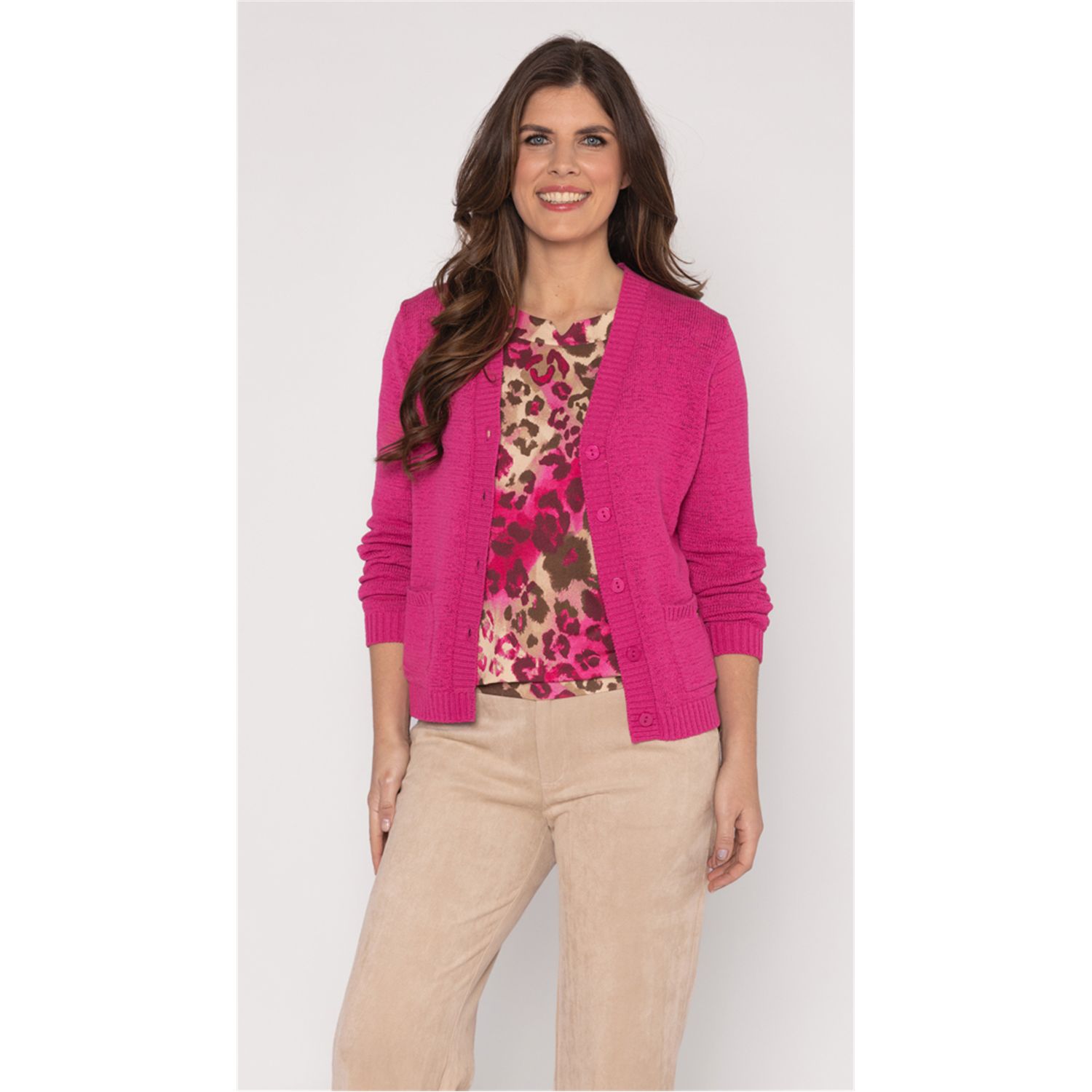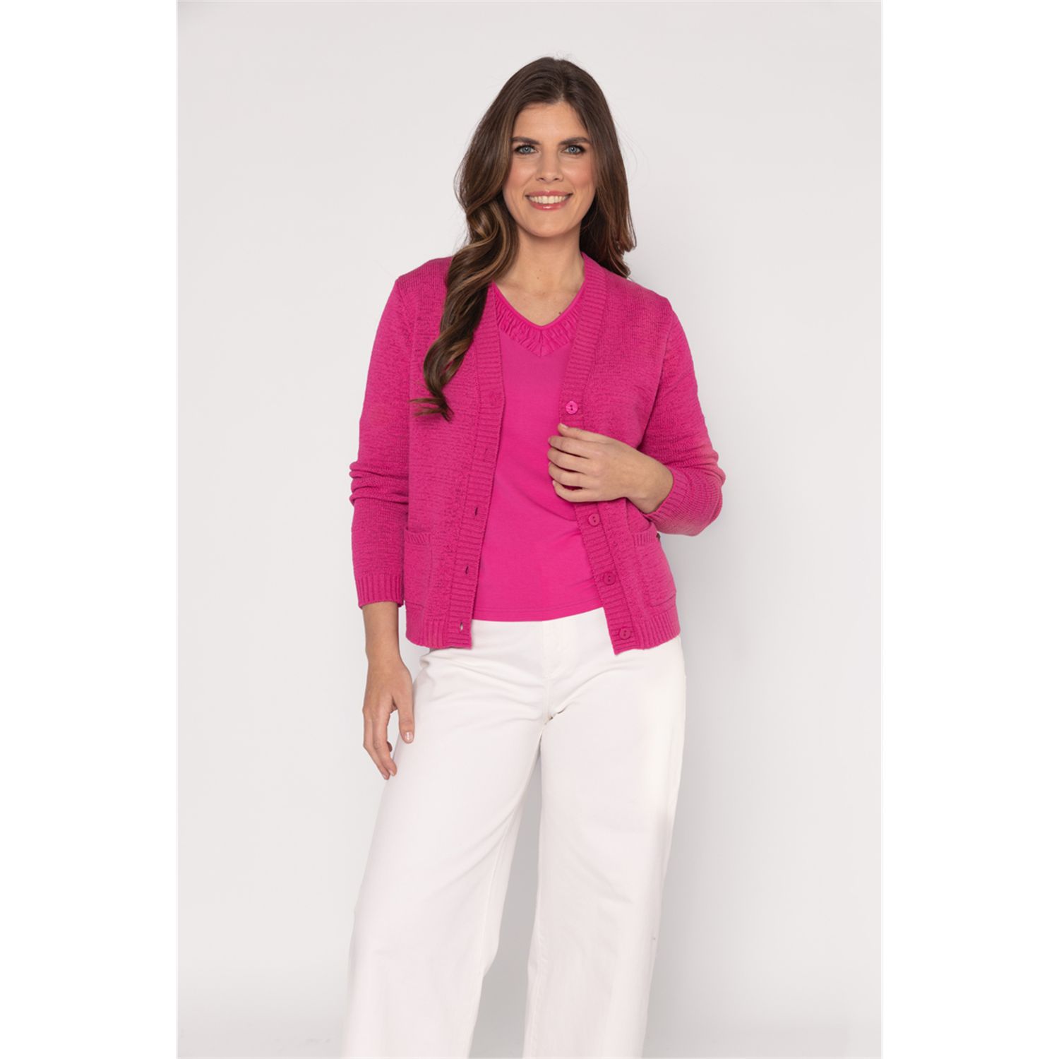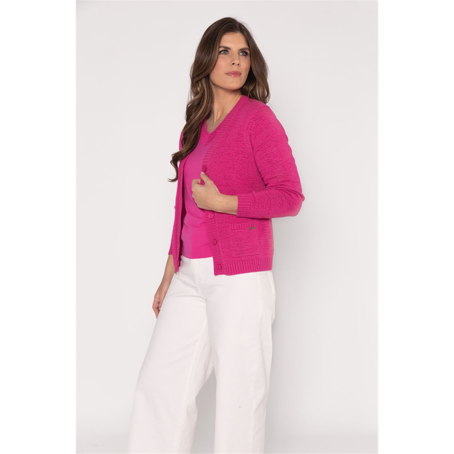 V-neck cardigan with button closure and 2 front pockets. Truly a spring vest as it wears cool due to the use of a cotton blend banded yarn. Available in multiple colors.