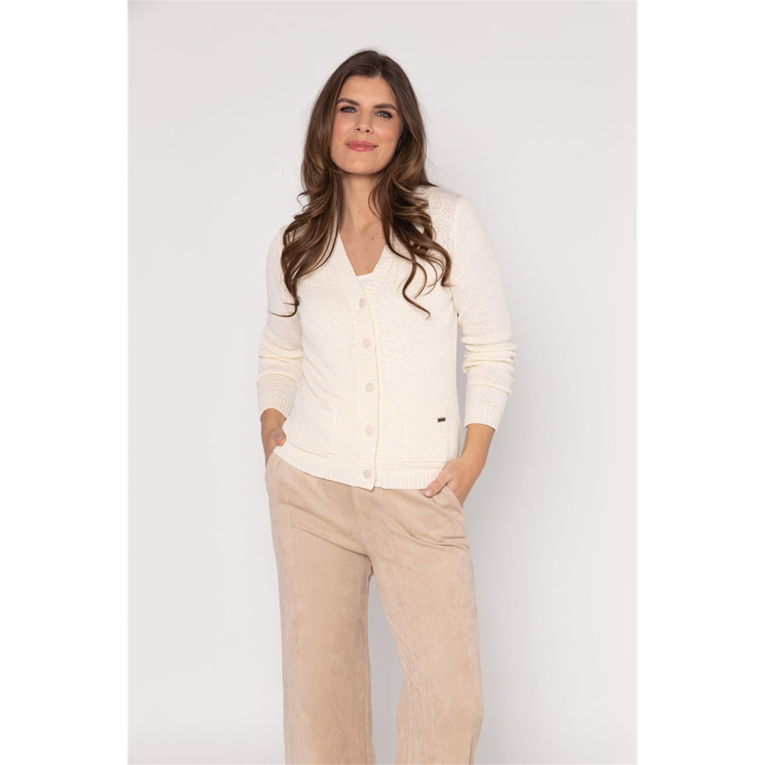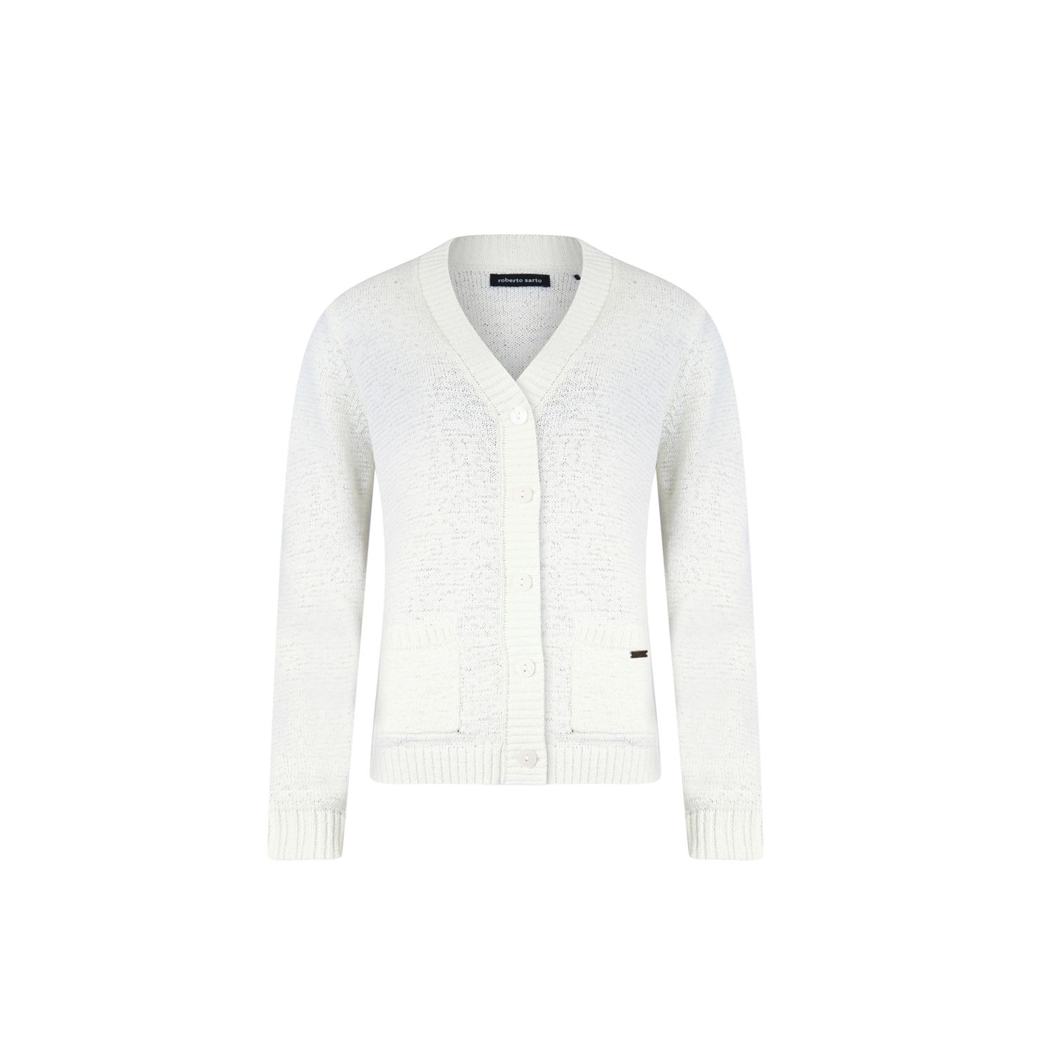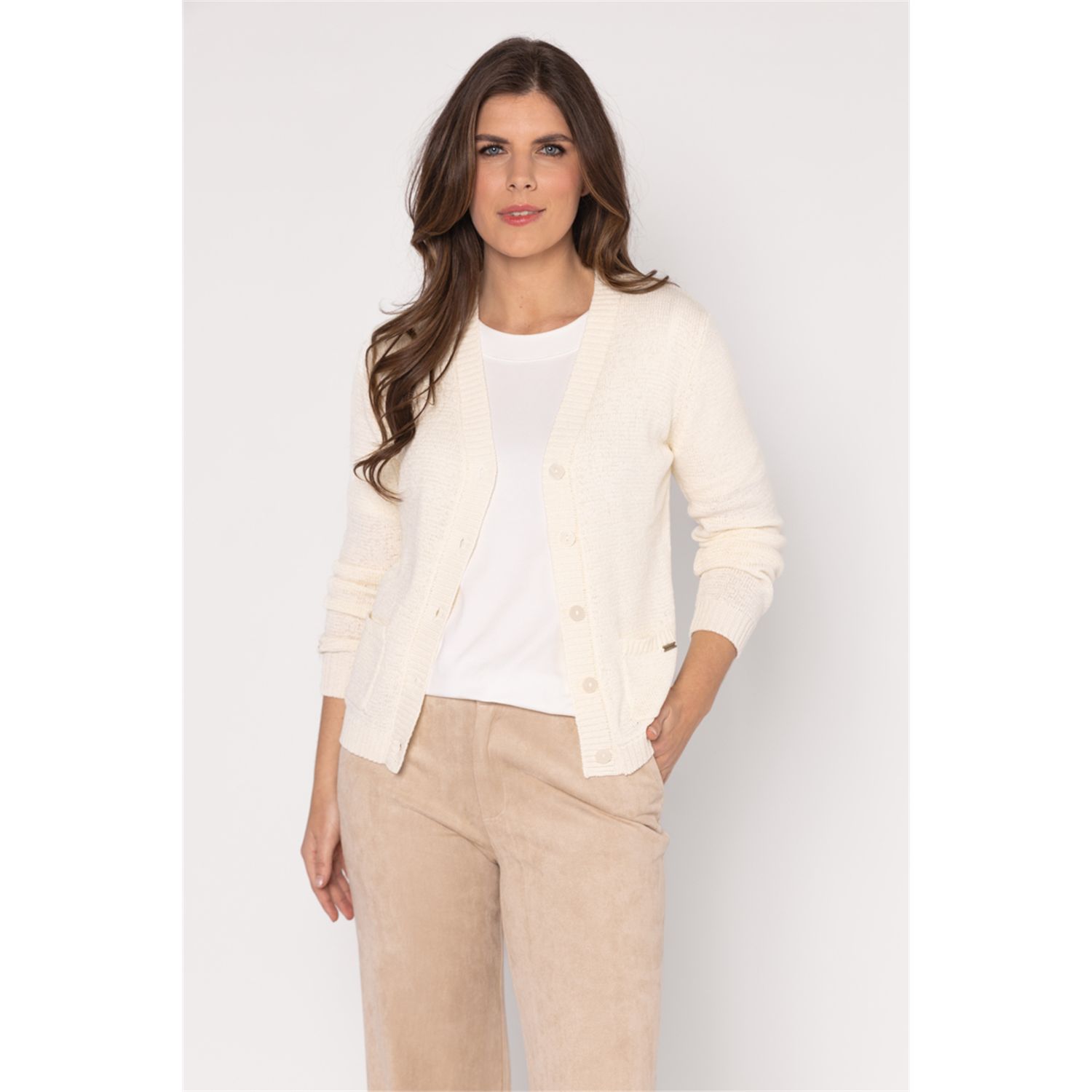 V-neck cardigan with button closure and 2 front pockets. Truly a spring vest as it wears cool due to the use of a cotton blend banded yarn. Available in multiple colors.