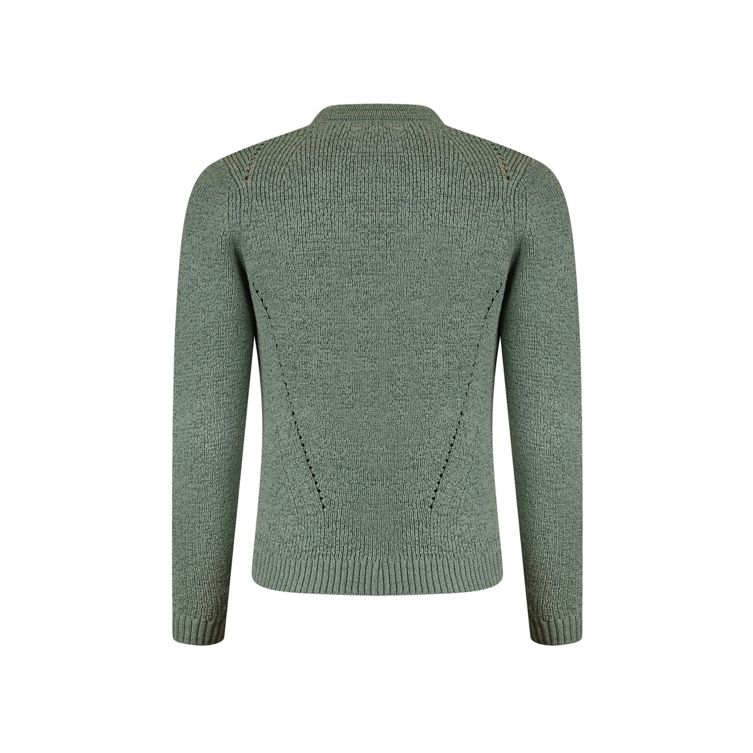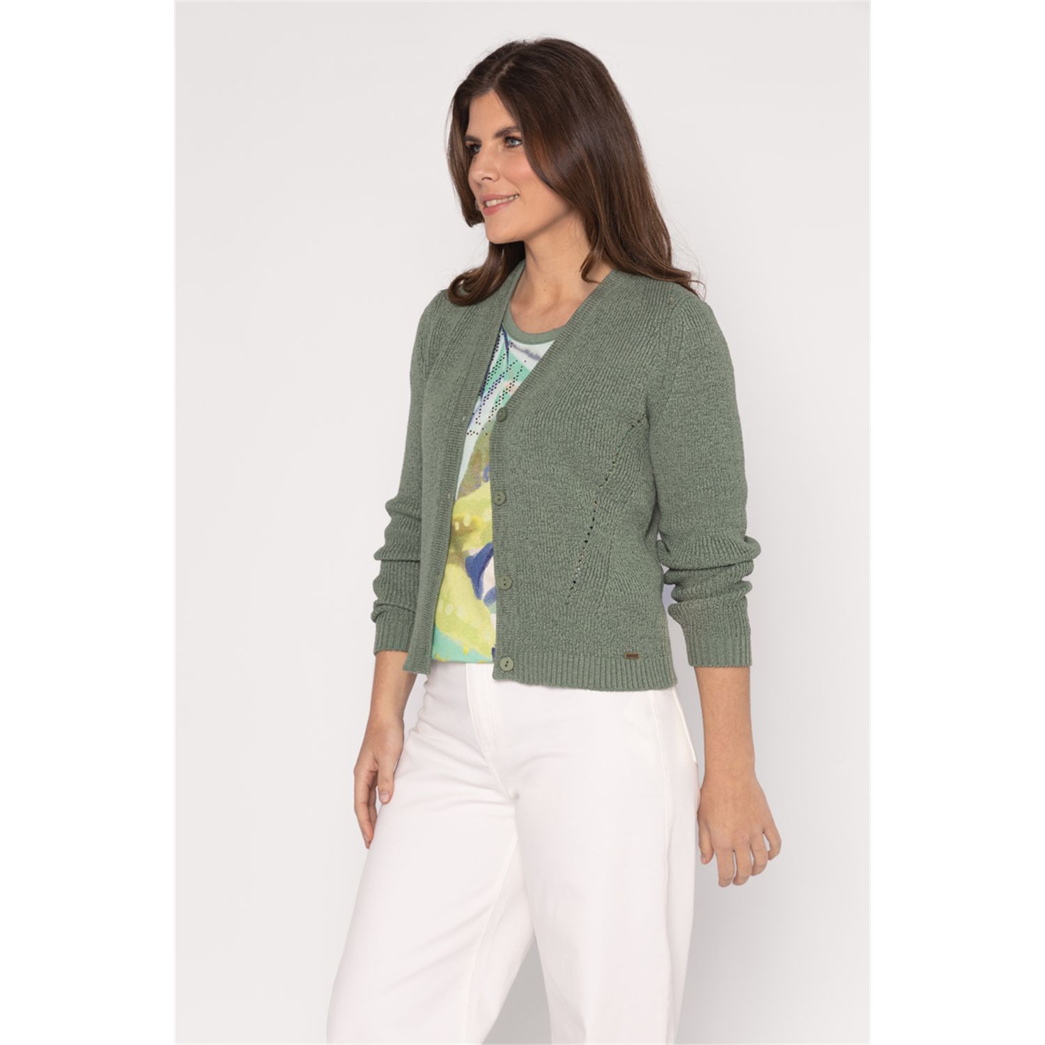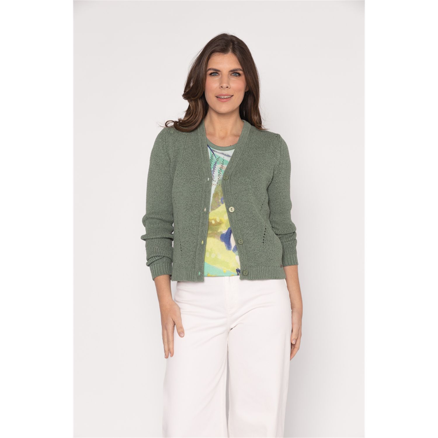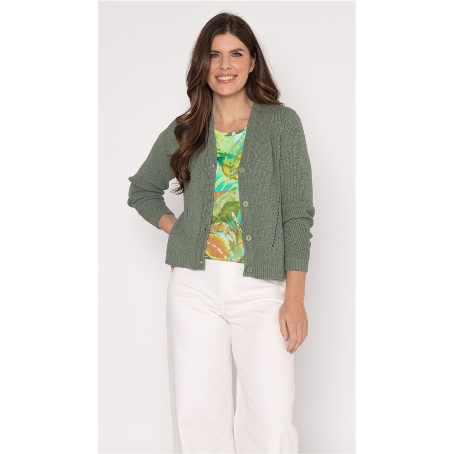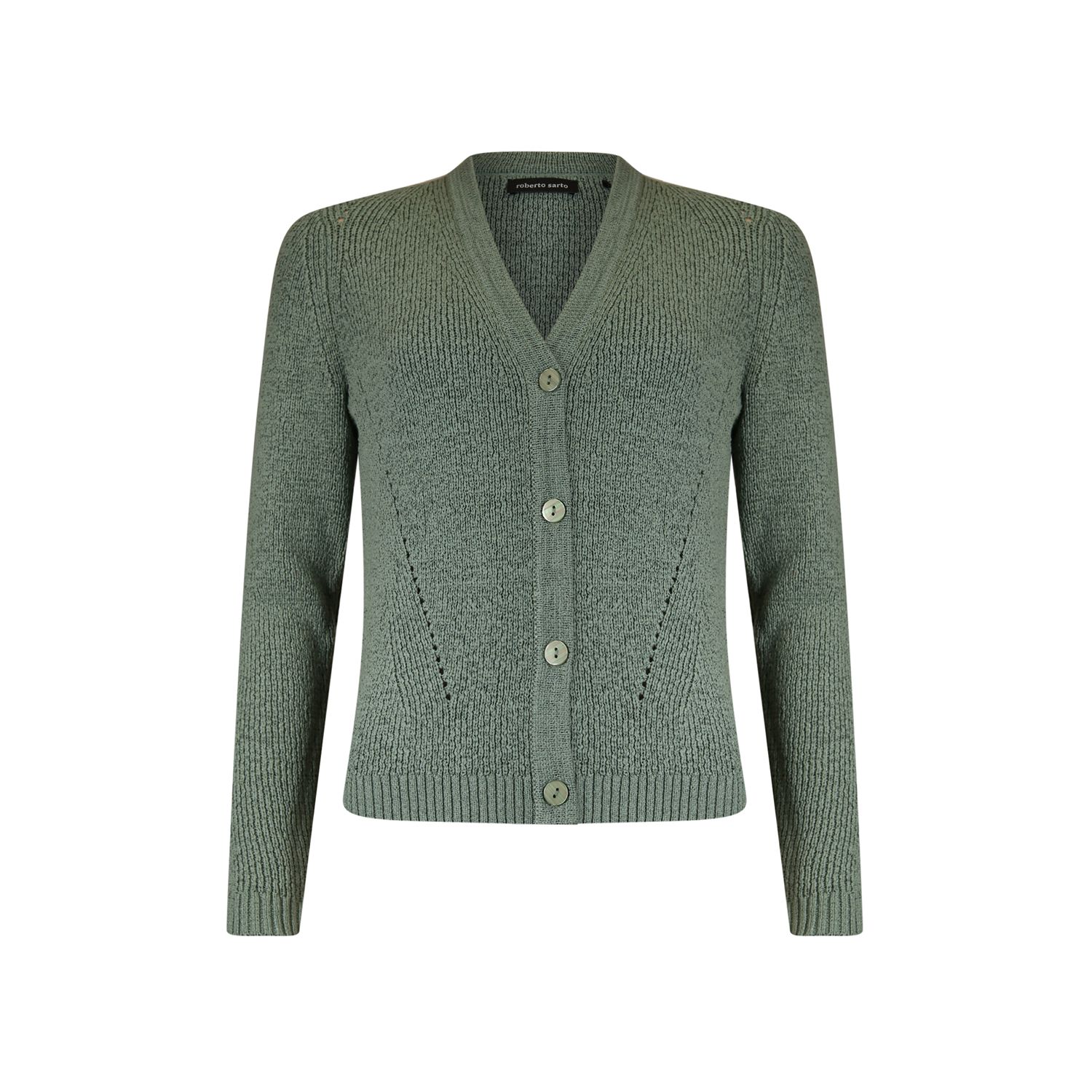 V-neck cardigan with button closure made of a cotton blend banded yarn with fancy diminutions. Available in multiple colors.