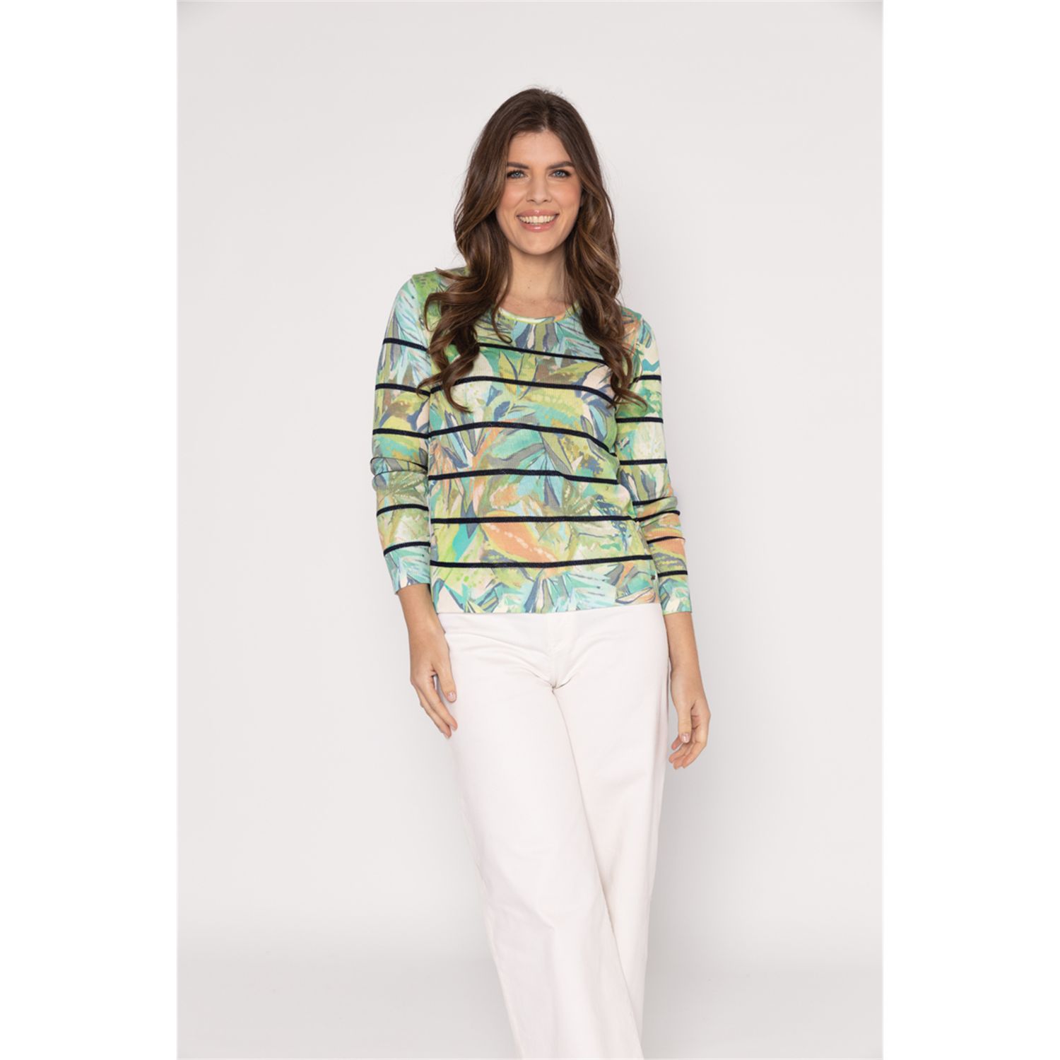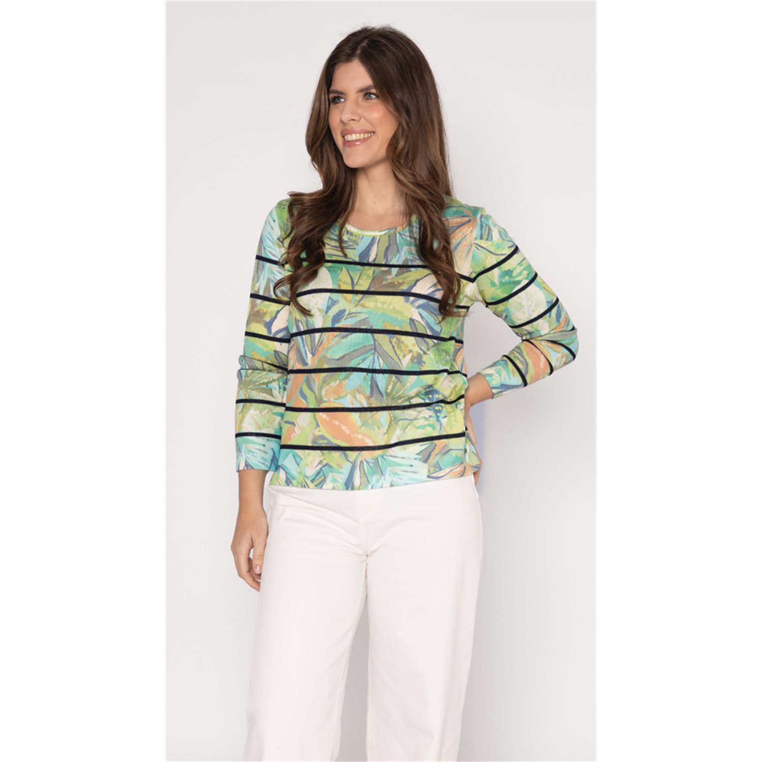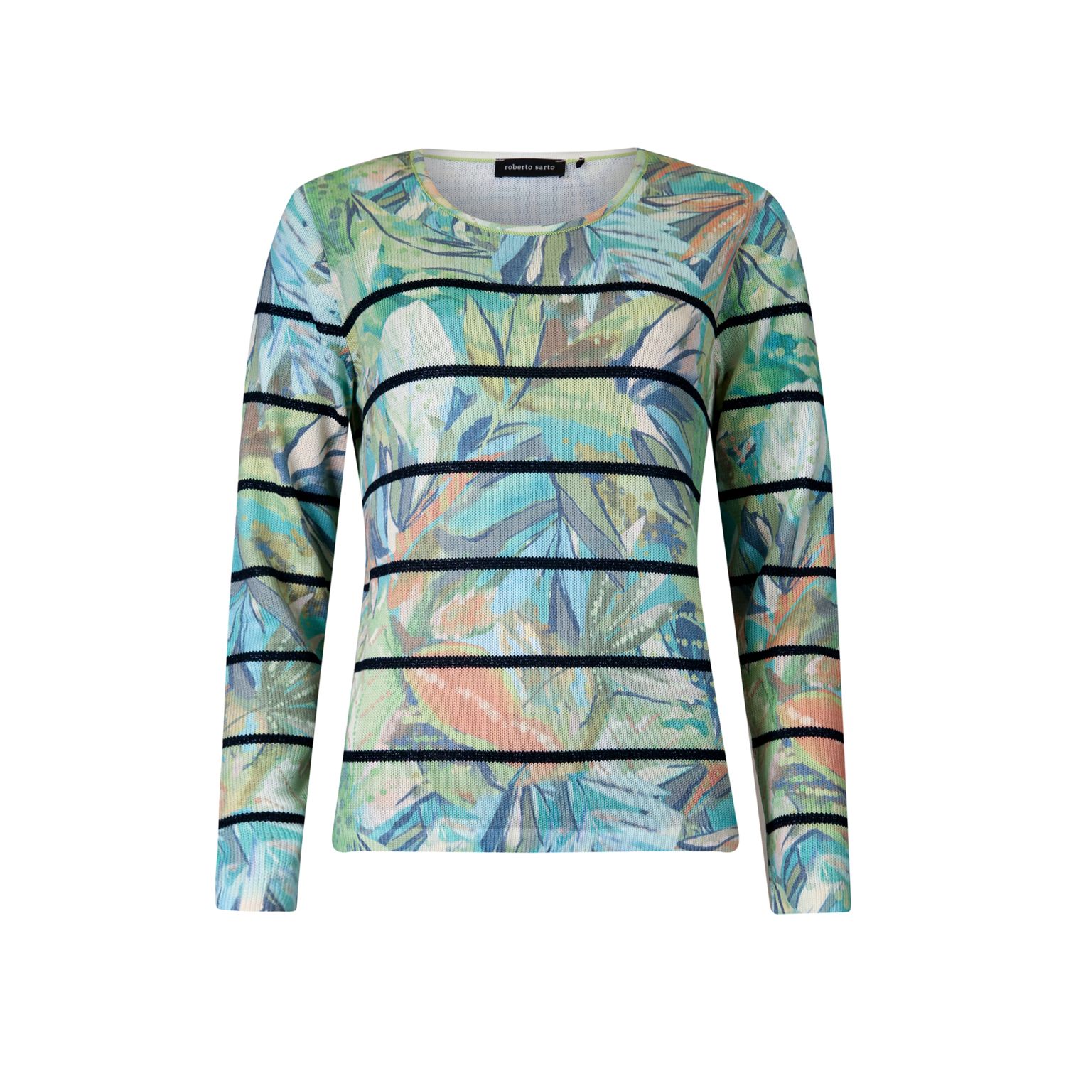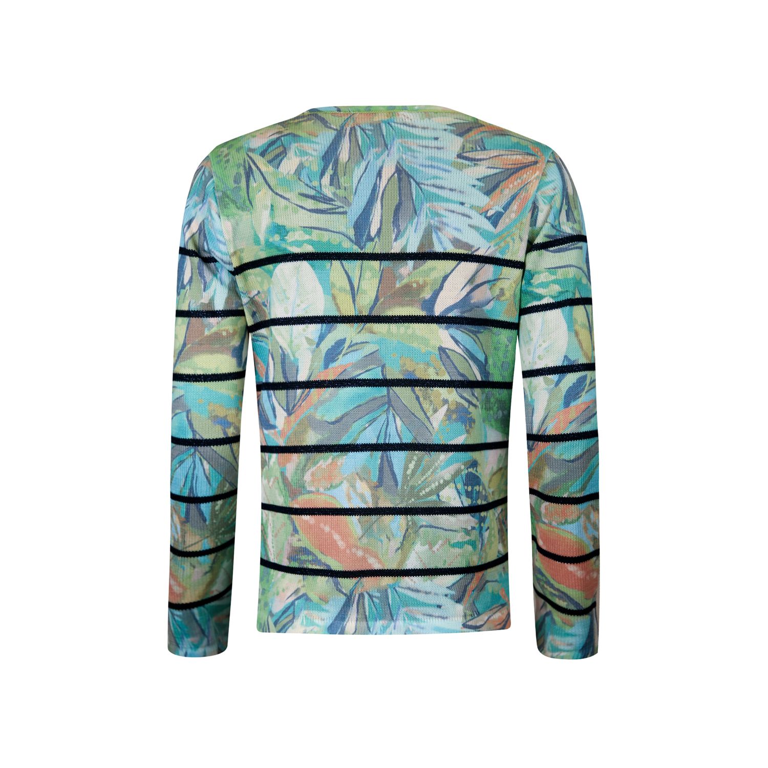 For cooler days, here's this lovely spring pullover with O-neck and knit stripe design with a soft shiny thread. Over it a unique print. A cardigan is also available in this quality. Both with unique print.