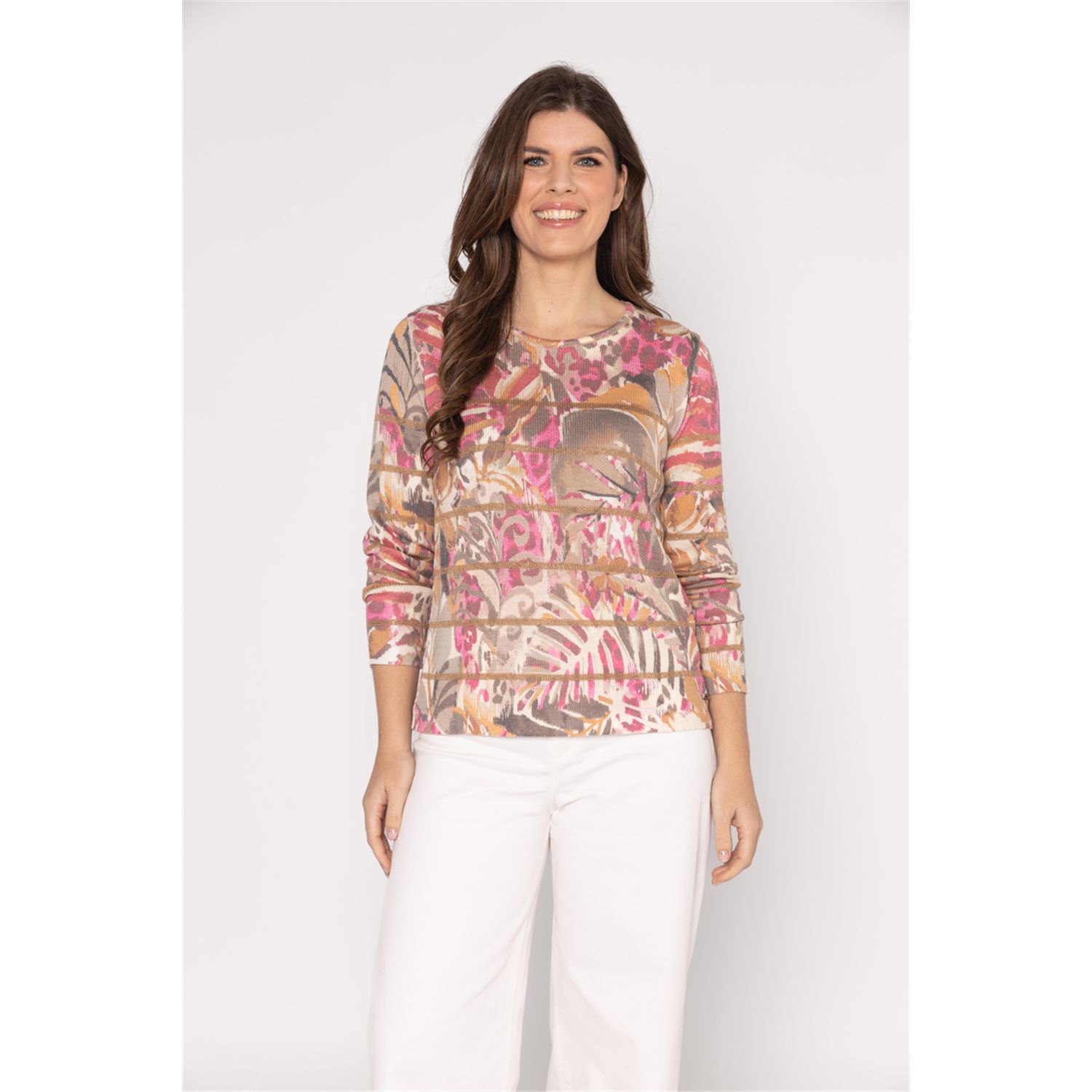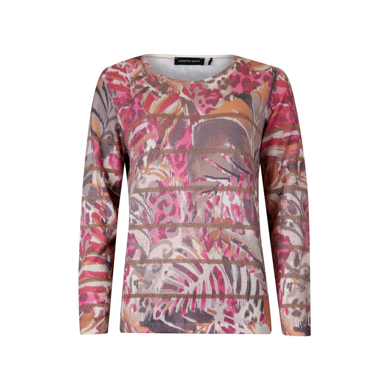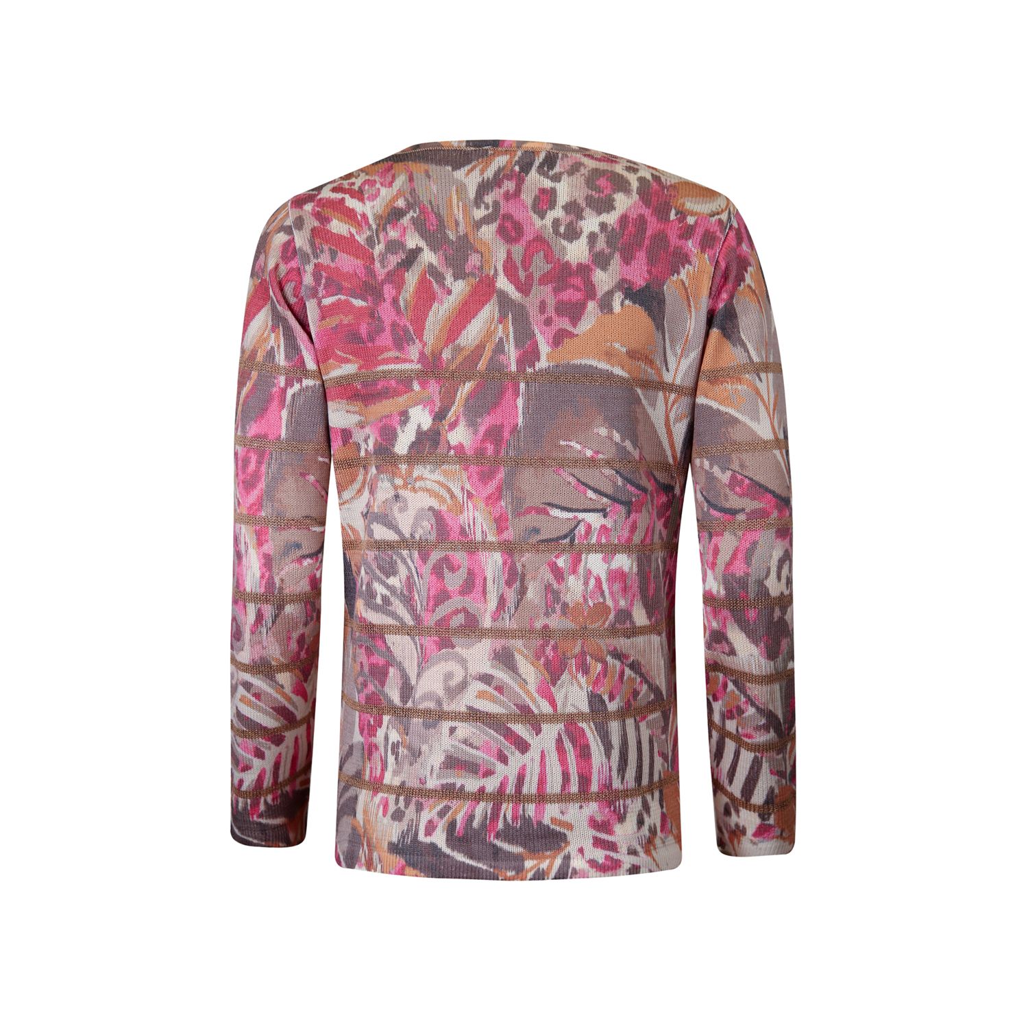 For cooler days, here's this lovely spring pullover with O-neck and knit stripe design with a soft shiny thread. Over it a unique print. A cardigan is also available in this quality. Both with unique print.