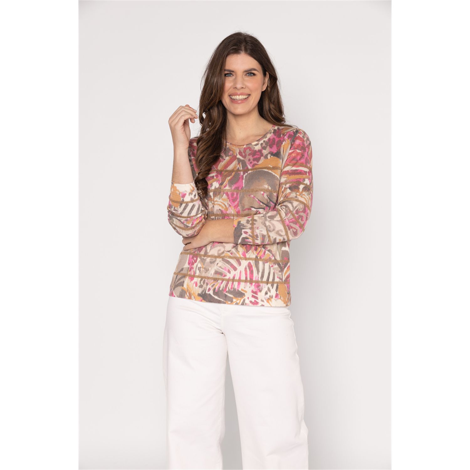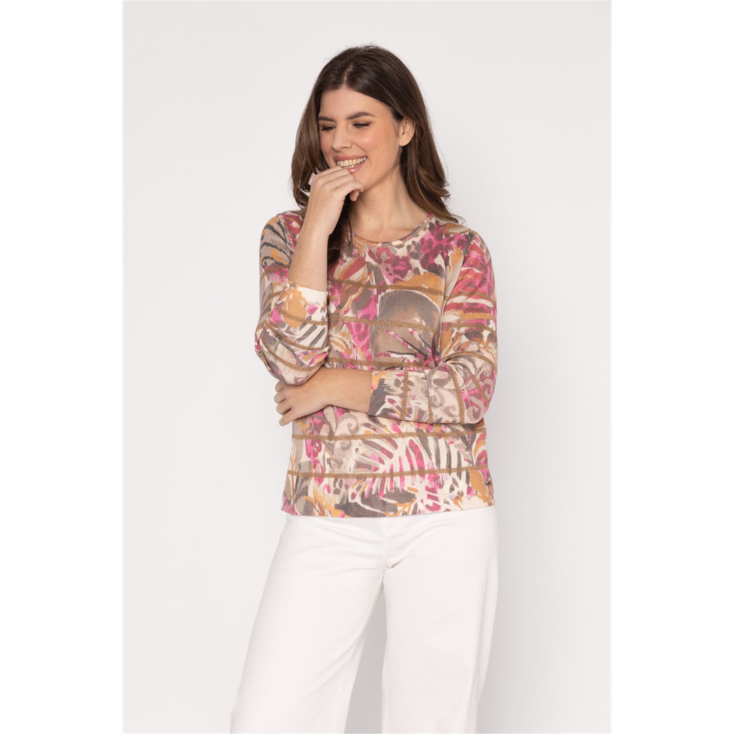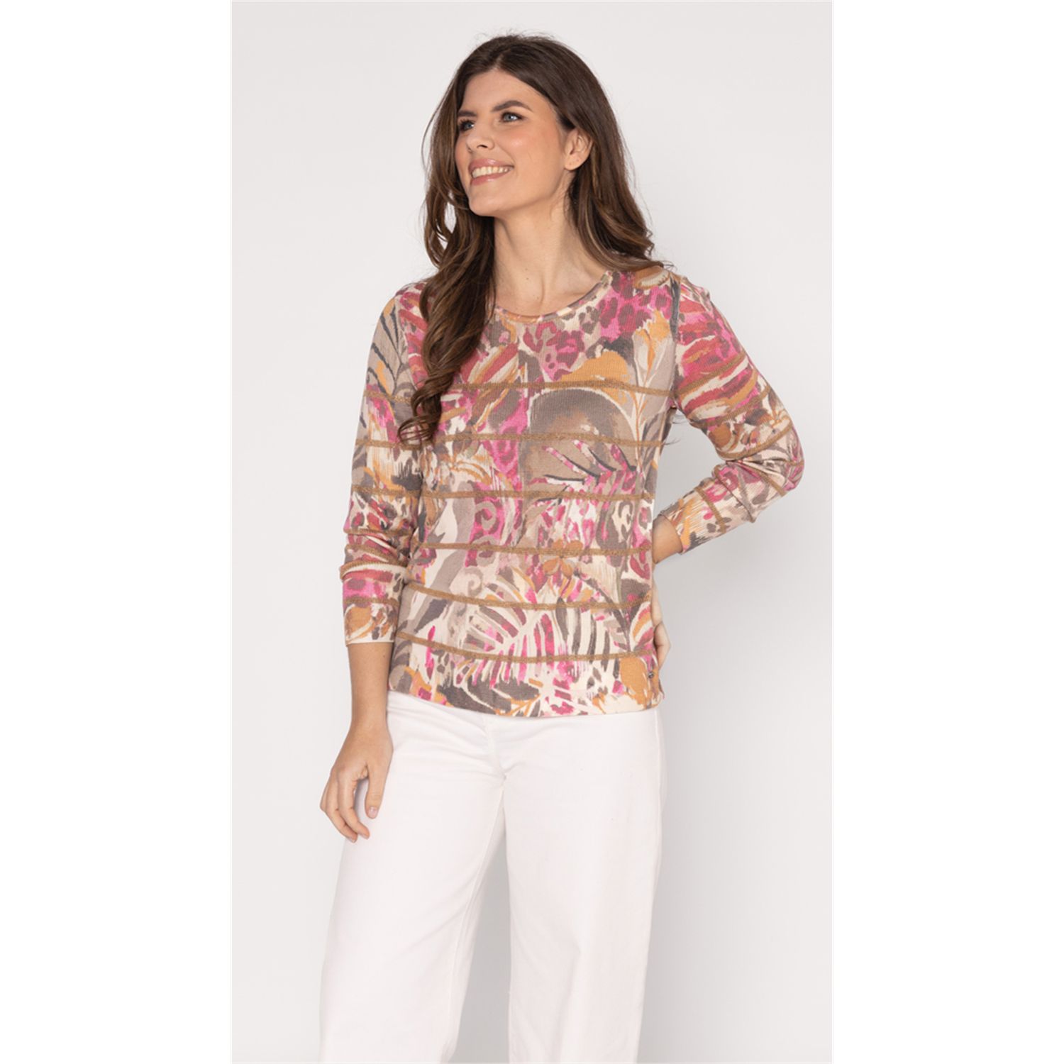 For cooler days, here's this lovely spring pullover with O-neck and knit stripe design with a soft shiny thread. Over it a unique print. A cardigan is also available in this quality. Both with unique print.