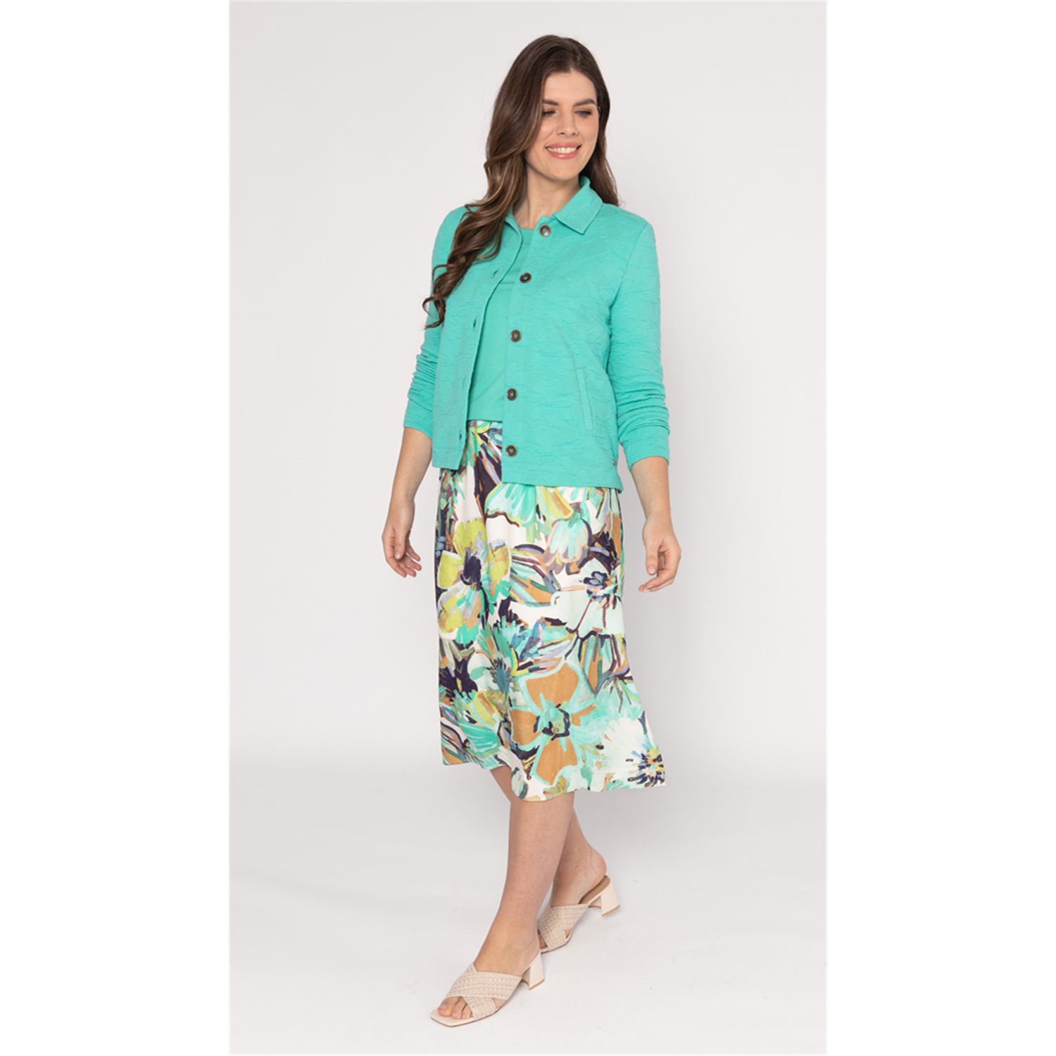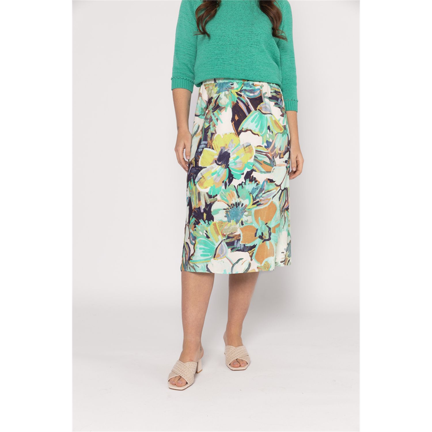 Printed calf-length slightly flared skirt 100% viscose supple woven fabric. The skirt has 2 side slits and a padded elastic waistband.