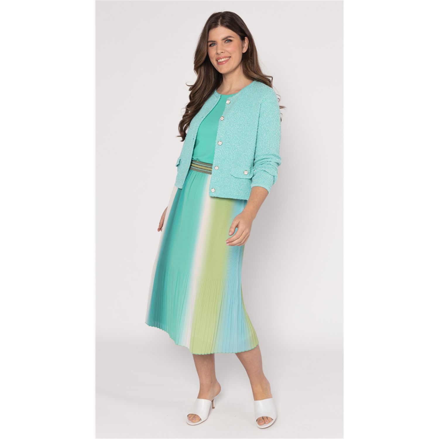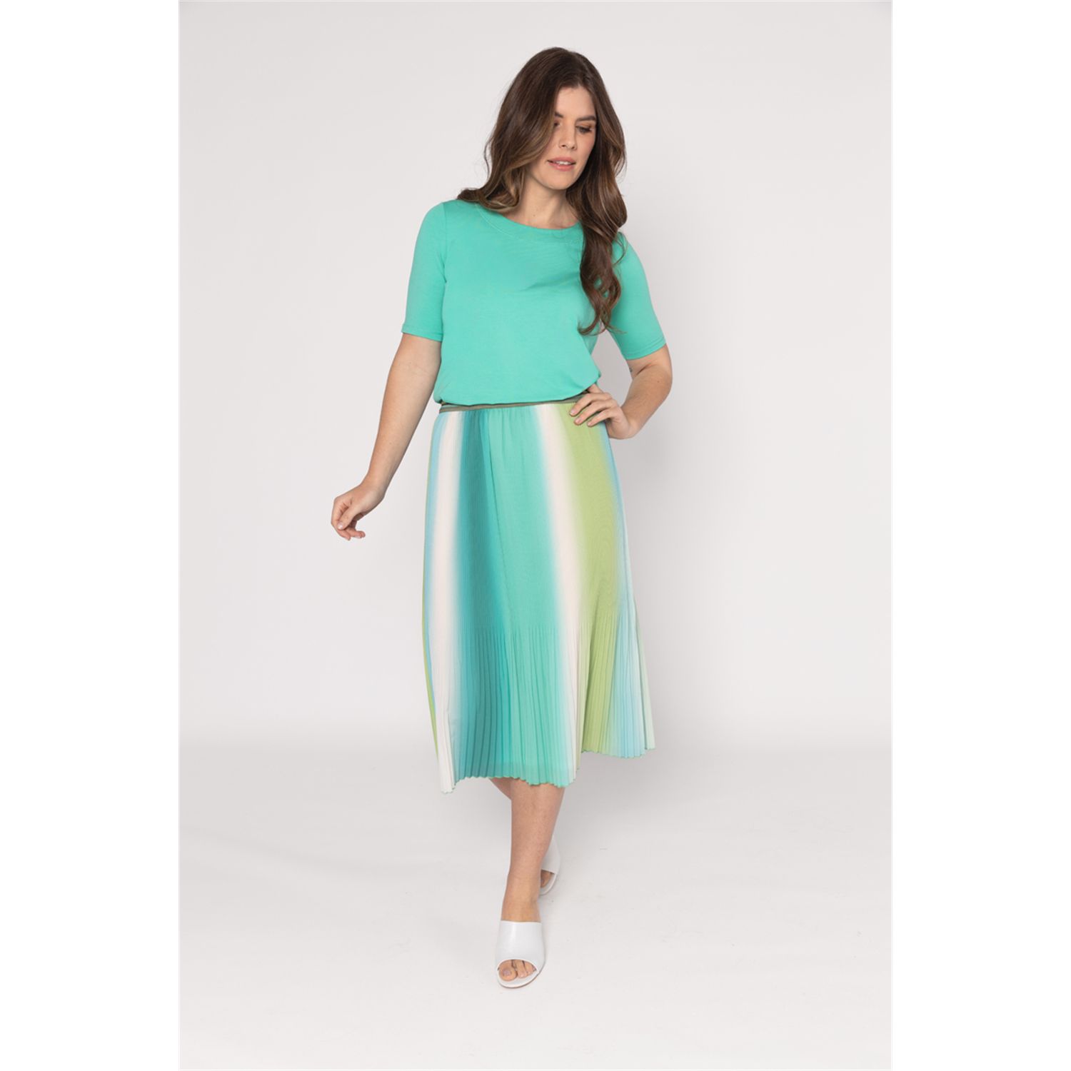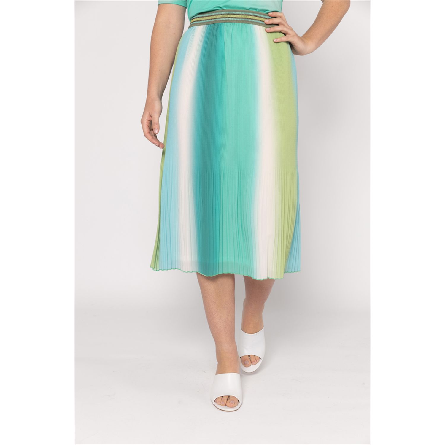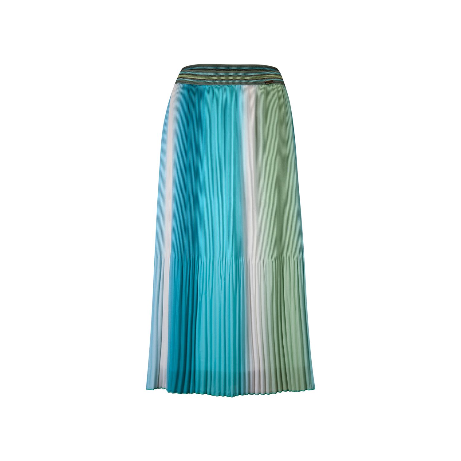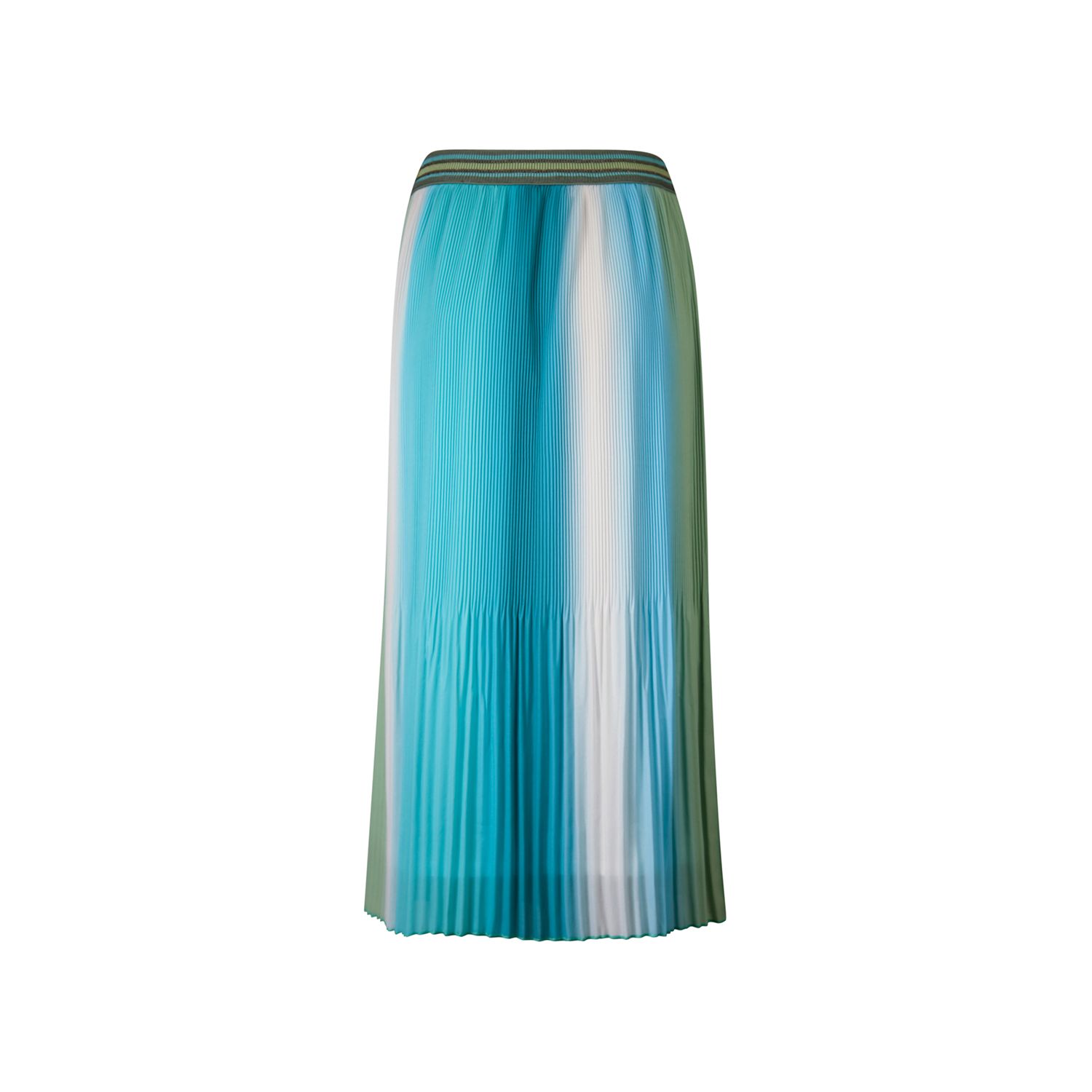 Printed woven chiffon skirt with a beautiful variegated plissé, narrow at the top and wider pleated at the bottom. The skirt has a lining. No closure needed due to the convenience of an elastic waistband.