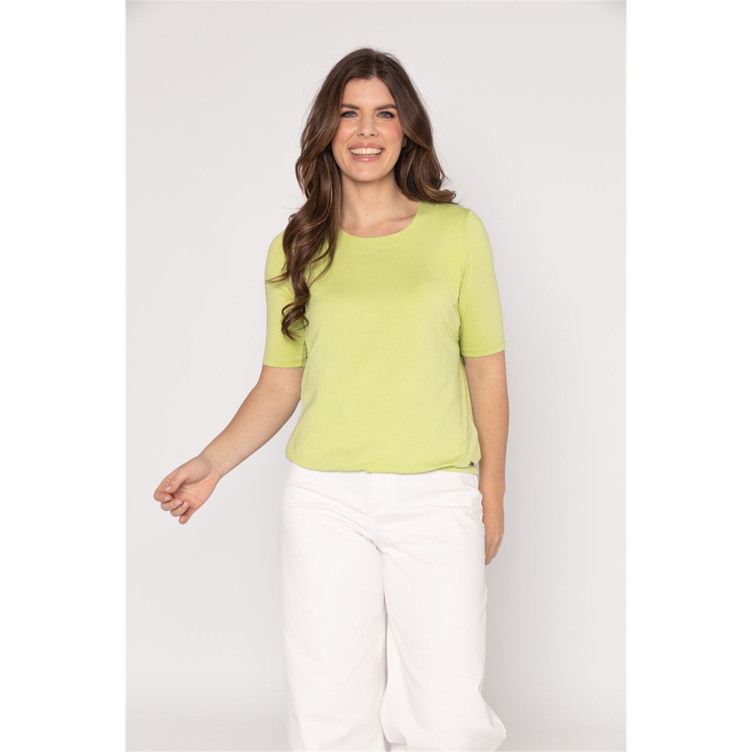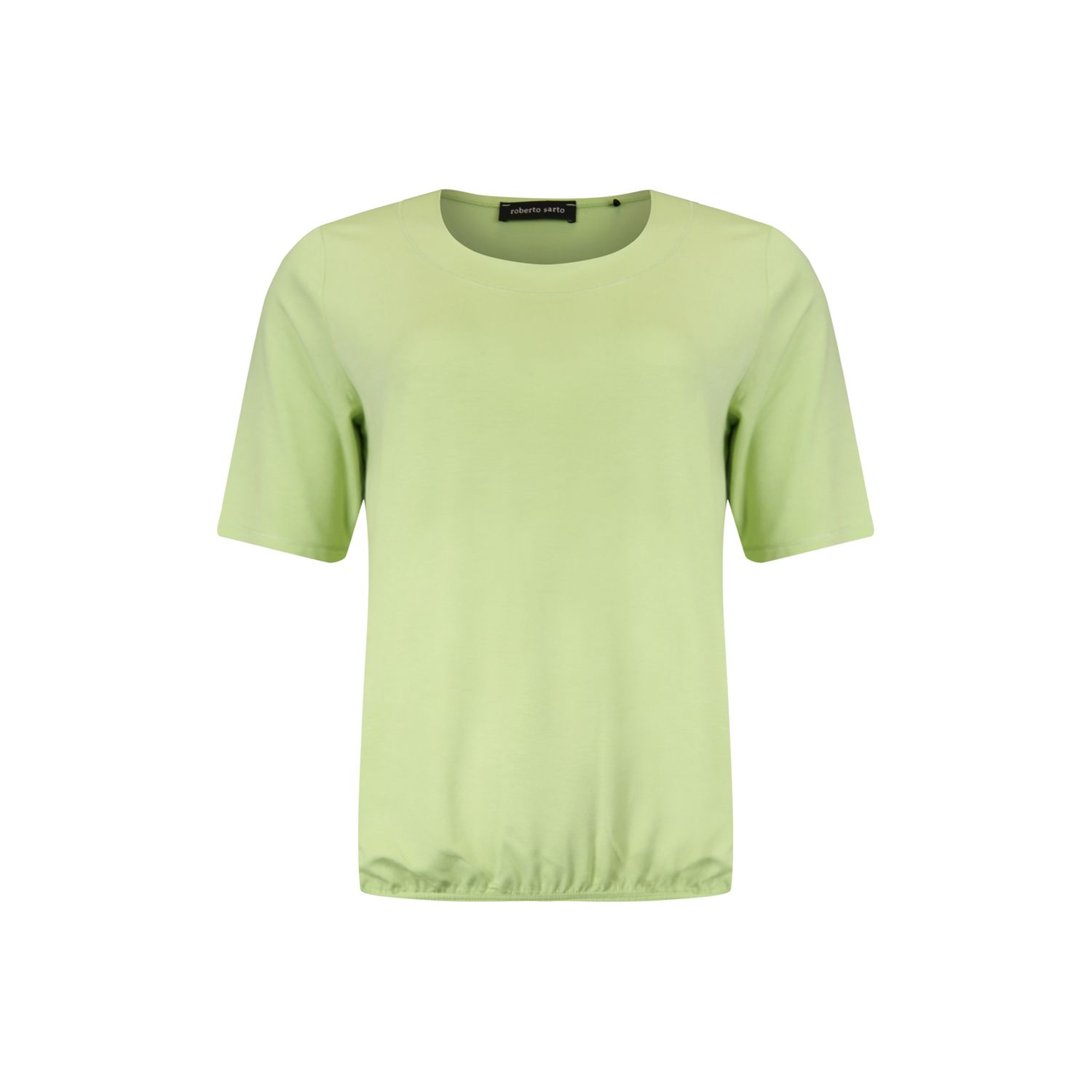 Round neck T-shirt with short sleeve that falls just above the elbow. The elastic hem ensures that the T-shirt fits nicely on the hip.