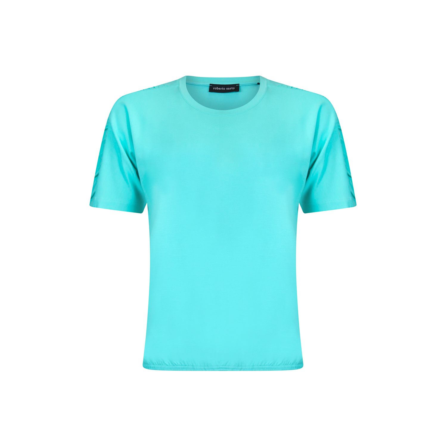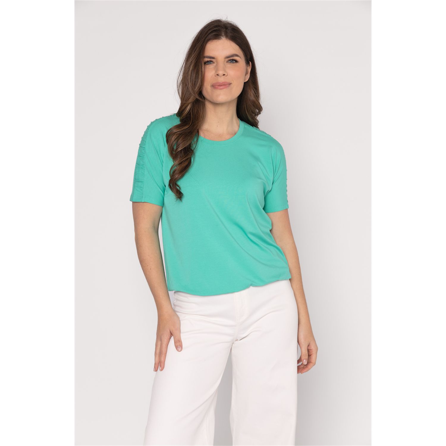 Blouson round neck with attached sleeves feature a smocked detail on shoulders. The elastic hem ensures that the T-shirt fits nicely at the hip.