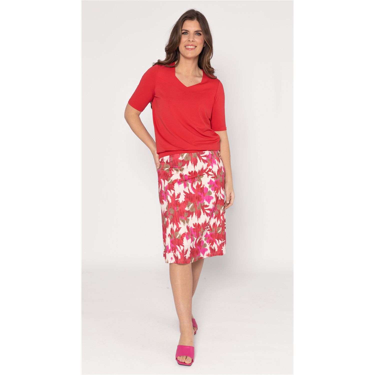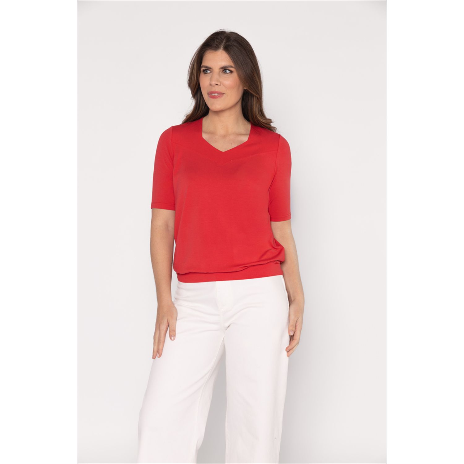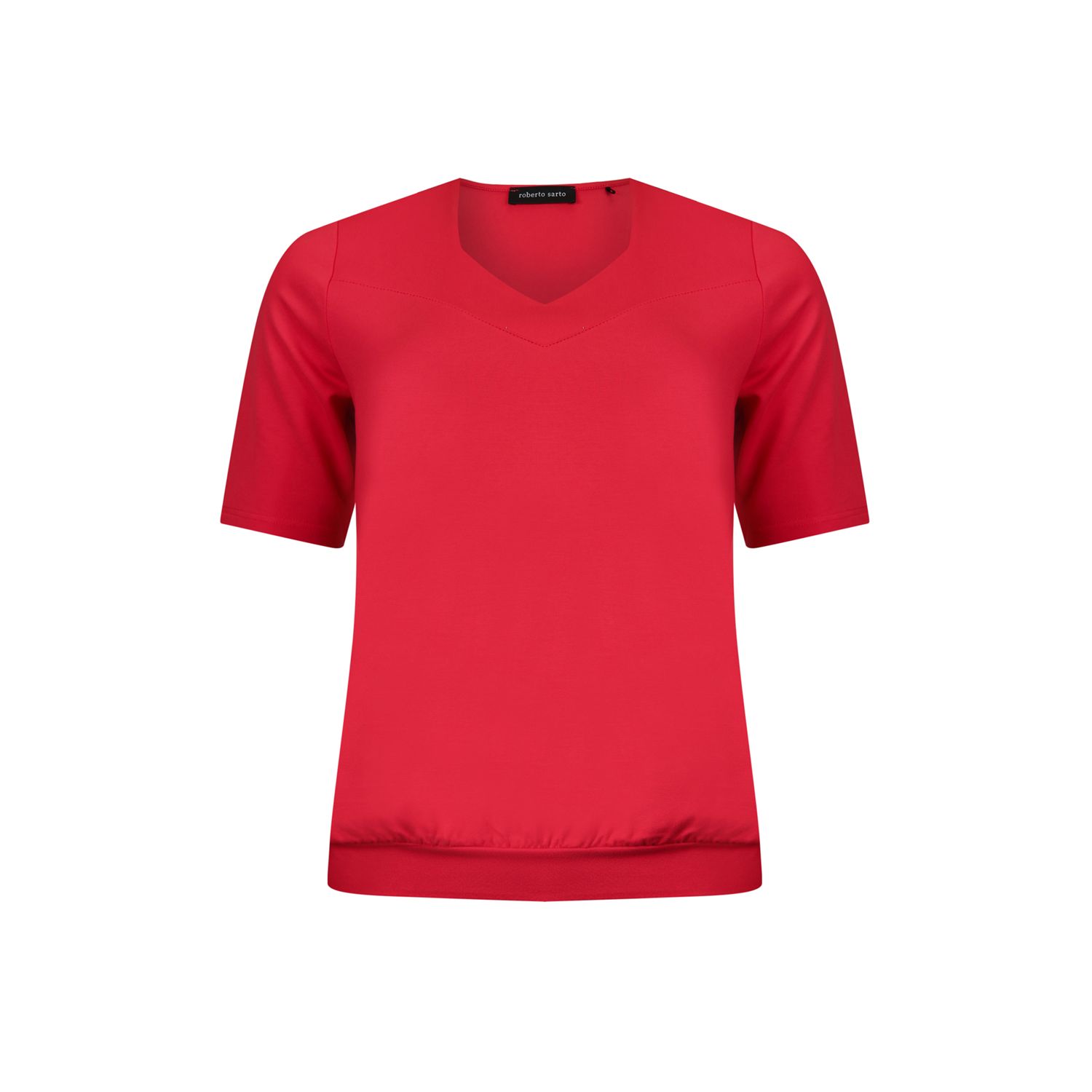 Blouson model T-shirt with afancy V-neckline and three-quarter sleeve. Available in several current uni colors.
