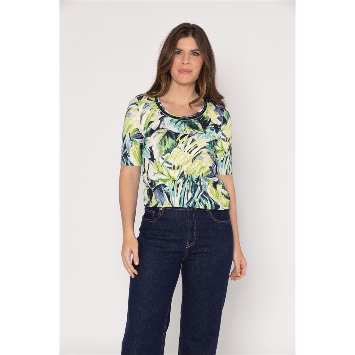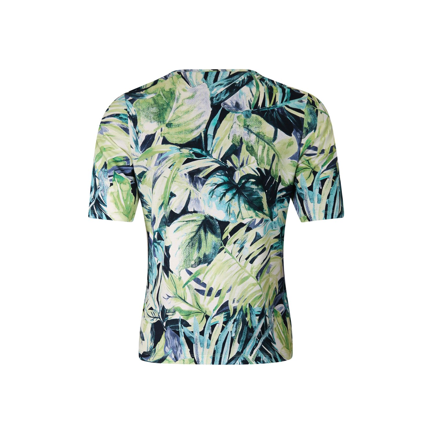 Slightly fitted O-neck T-shirt in viscose elasthan in fancy jersey with short sleeve to just above the elbow, with fancy O-neck. Available in various fancy prints.