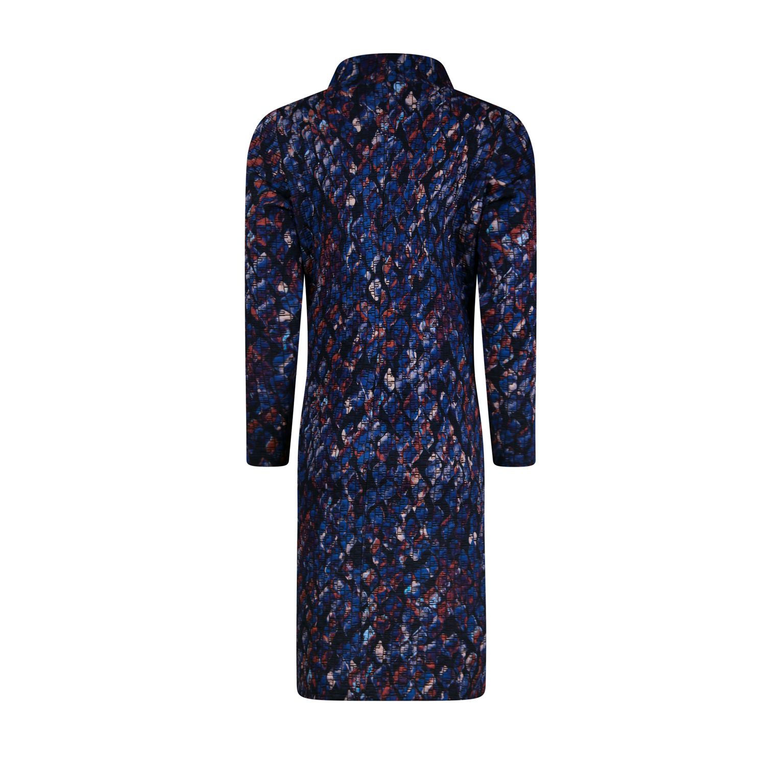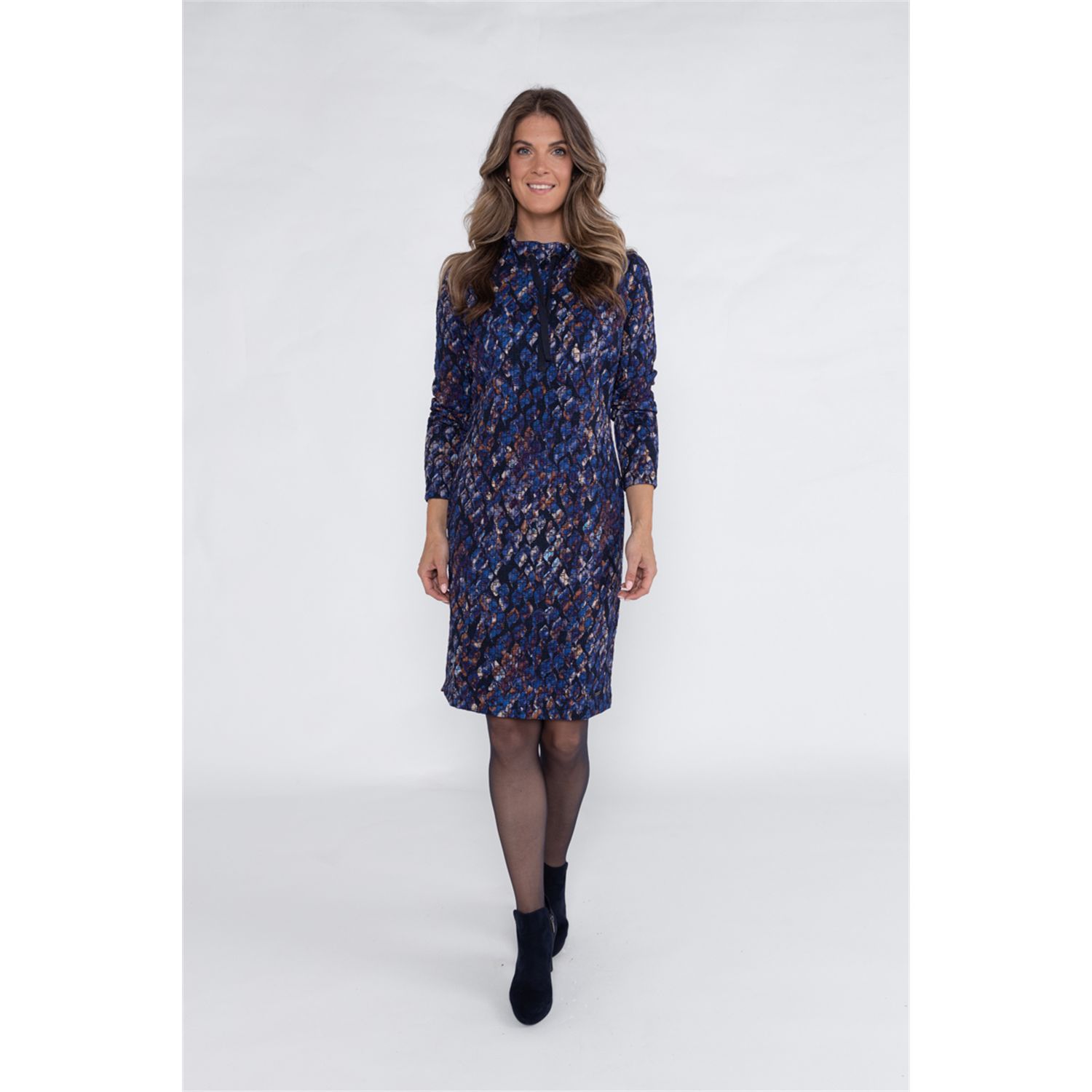 Jurk in een geprinte jacquard structuurstof met opstaande kraag. De stof is net wat dikker waardoor het comfortabel draagt. Jurk is licht getailleerd. Lengte net over de knie. De jurk heeft verder geen sluiting.