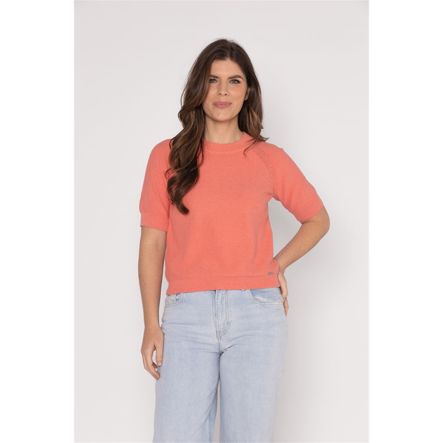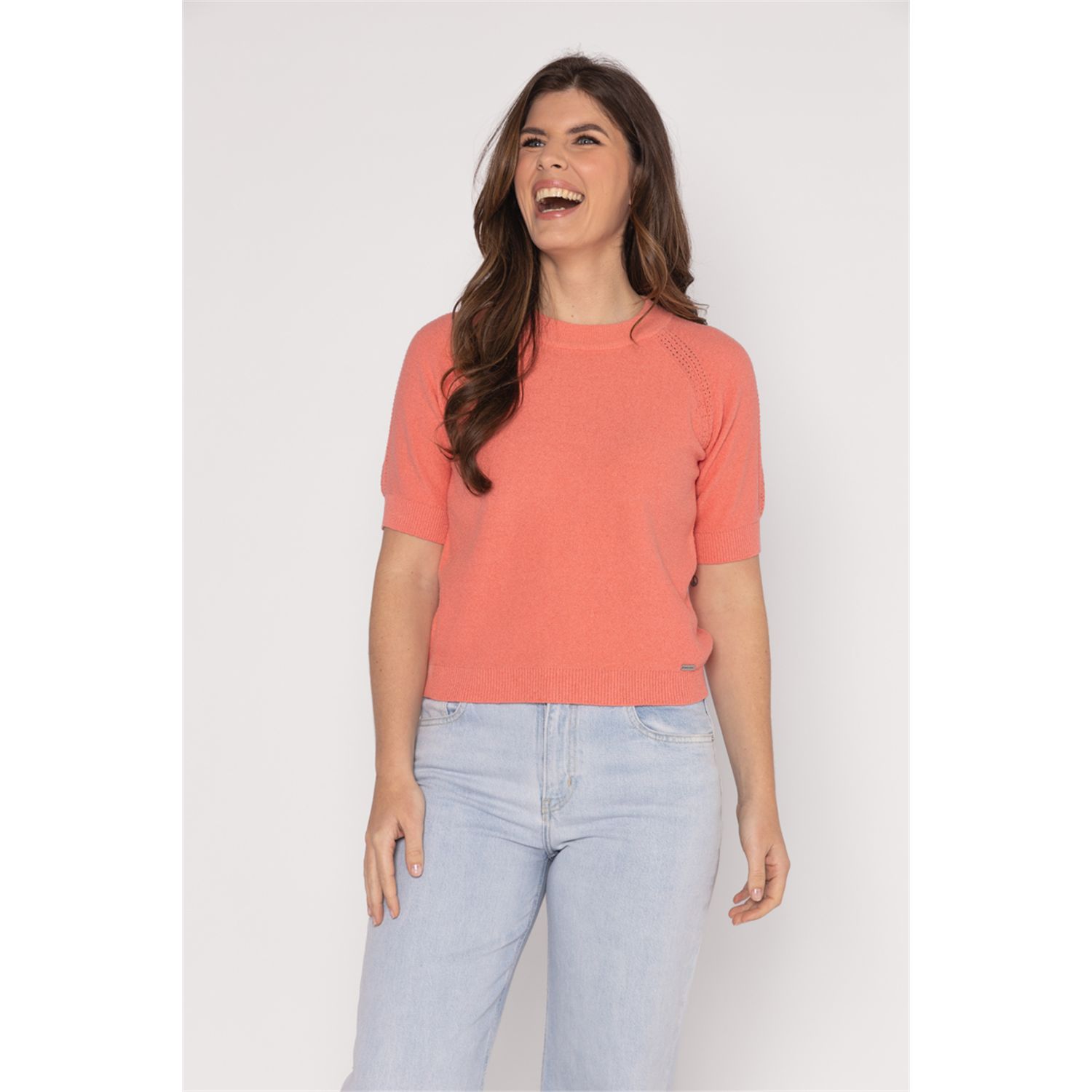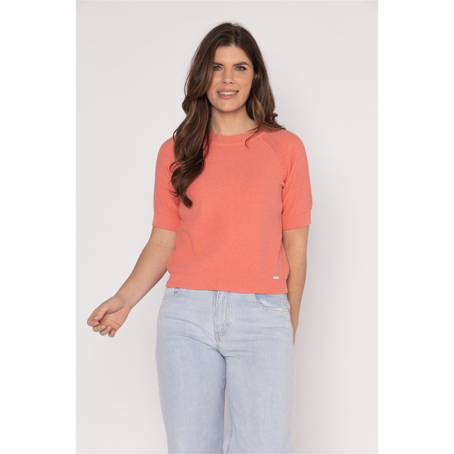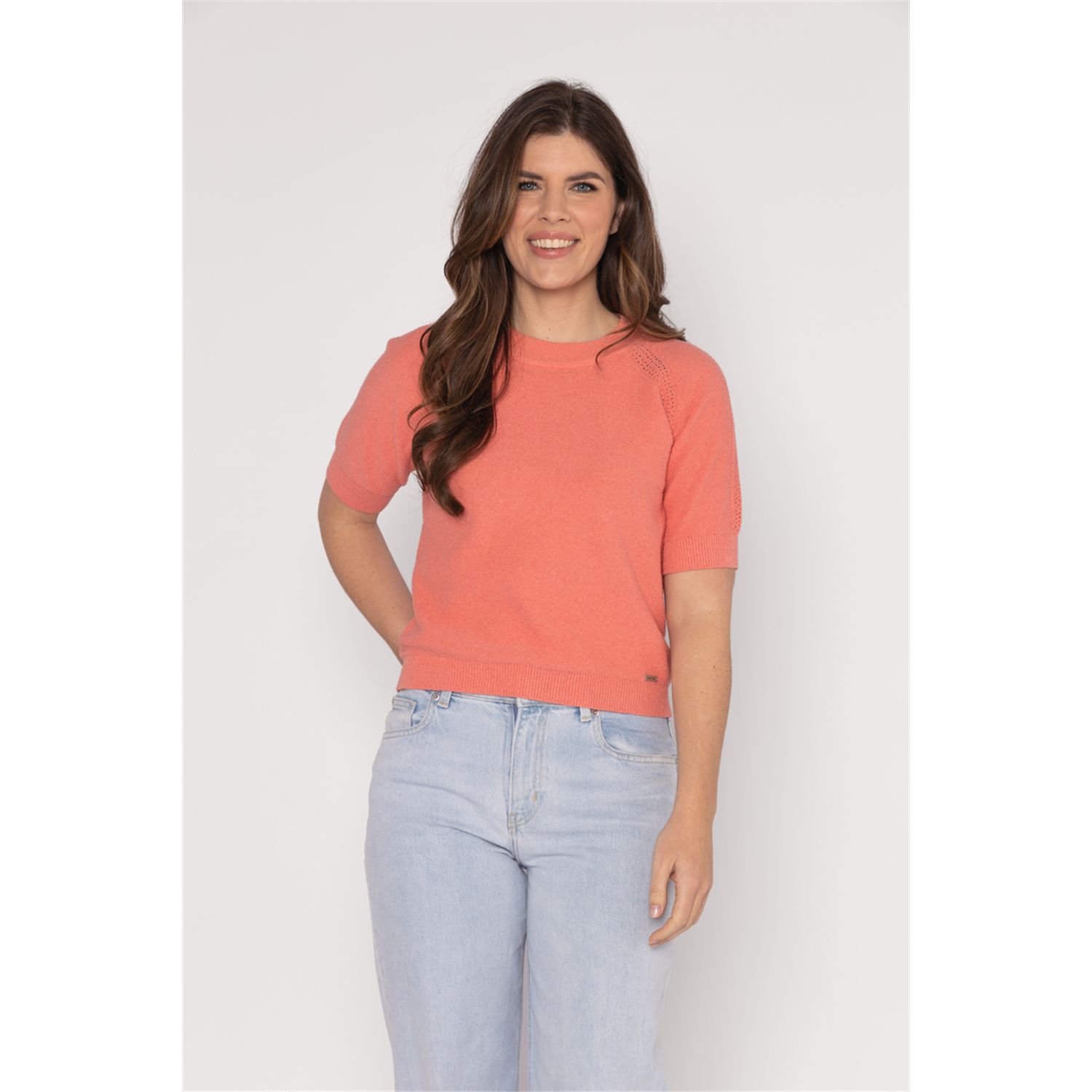 Zomers ronde hals truitje met driekwart mouwen en sierlijke ajour details.