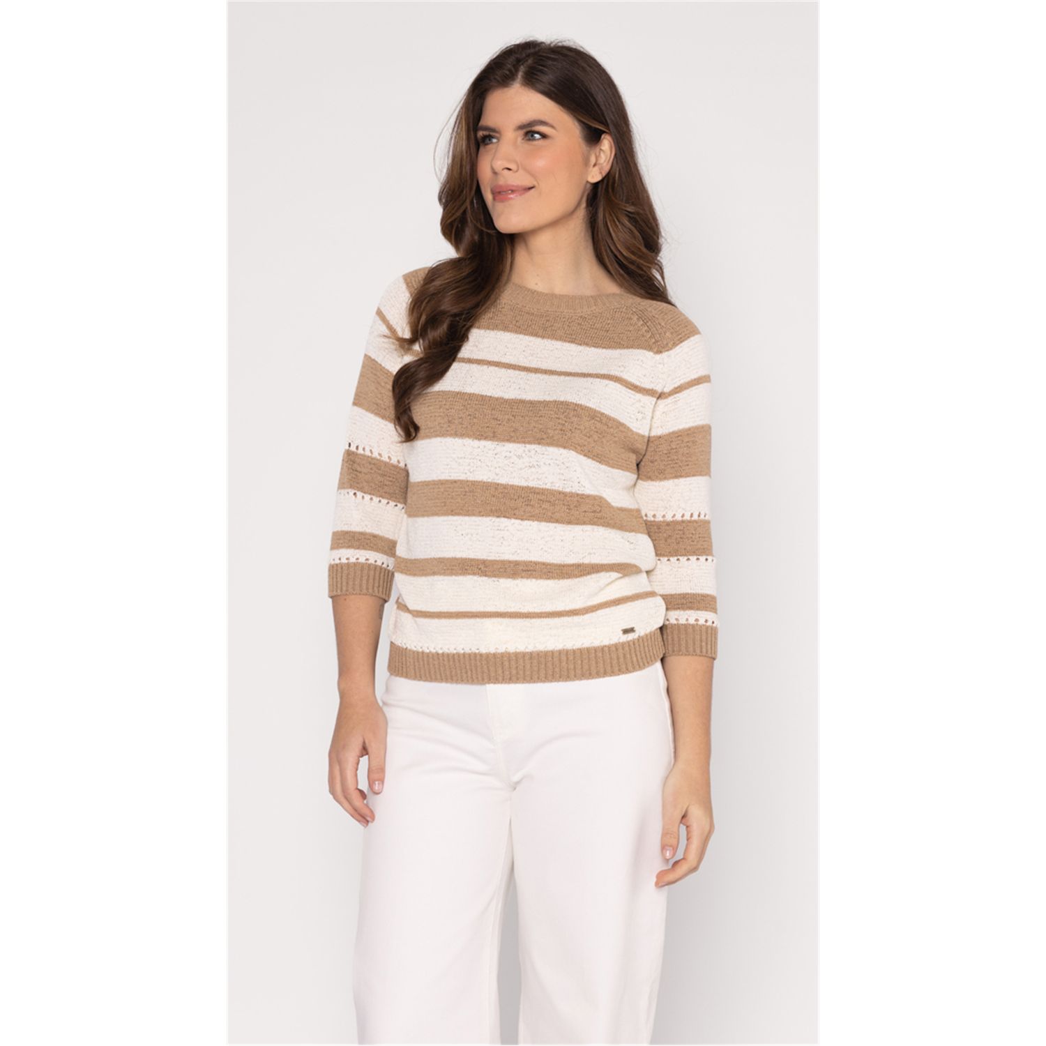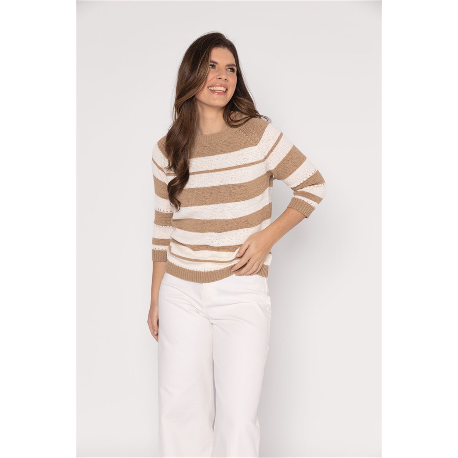 Pullover met driekwart mouwen in mooi bandjesgaren in katoenmix. Verkrijgbaar in diverse kleuren en 2 gestreepte kleur combinaties.