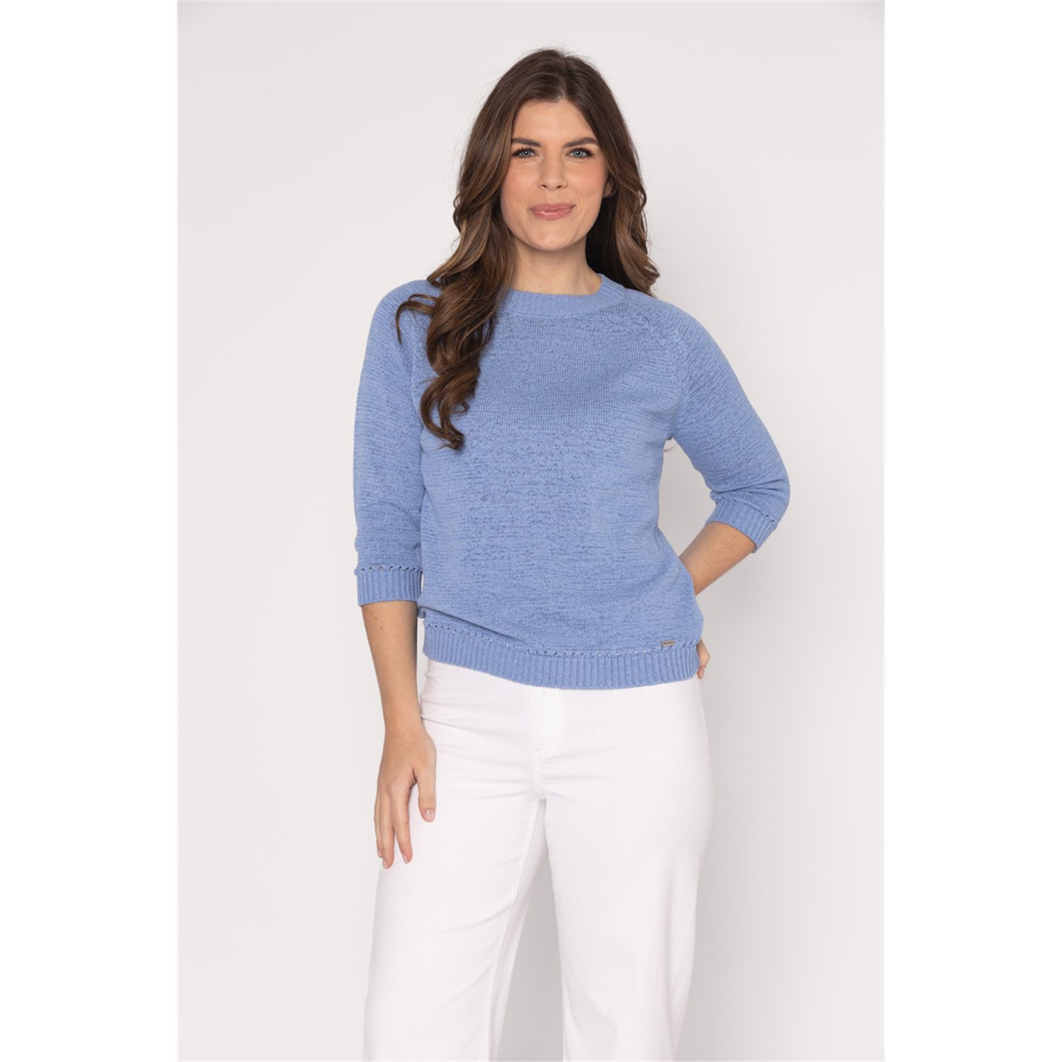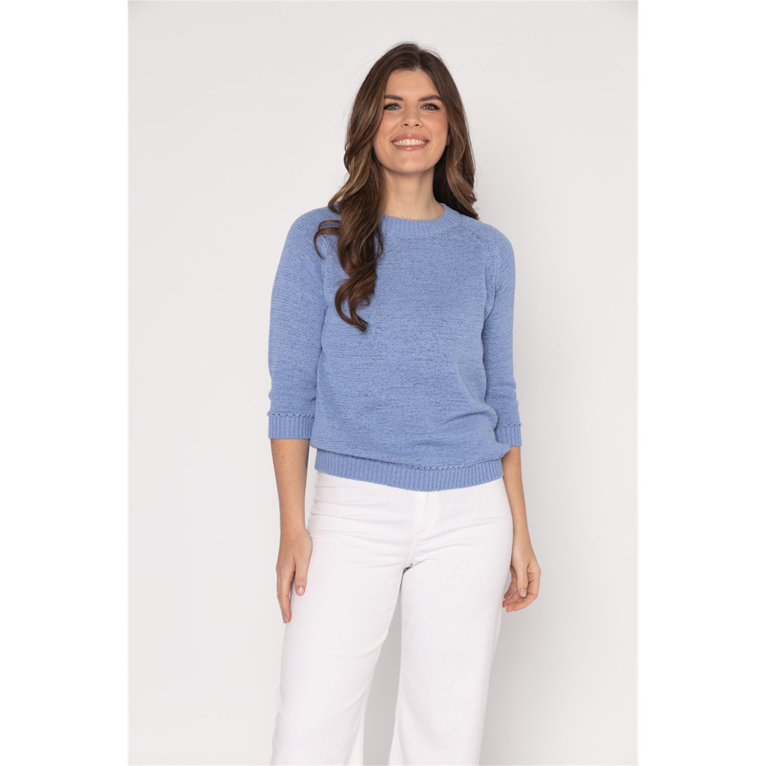Pullover met driekwart mouwen in mooi bandjesgaren in katoenmix. Verkrijgbaar in diverse kleuren en 2 gestreepte kleur combinaties.
