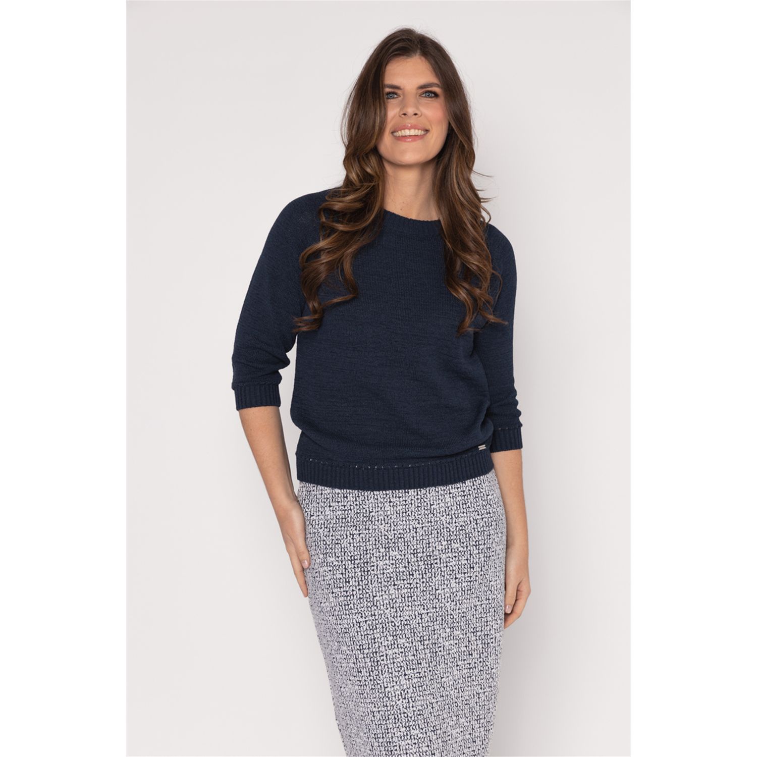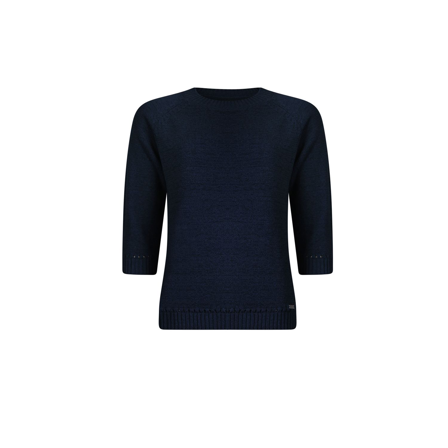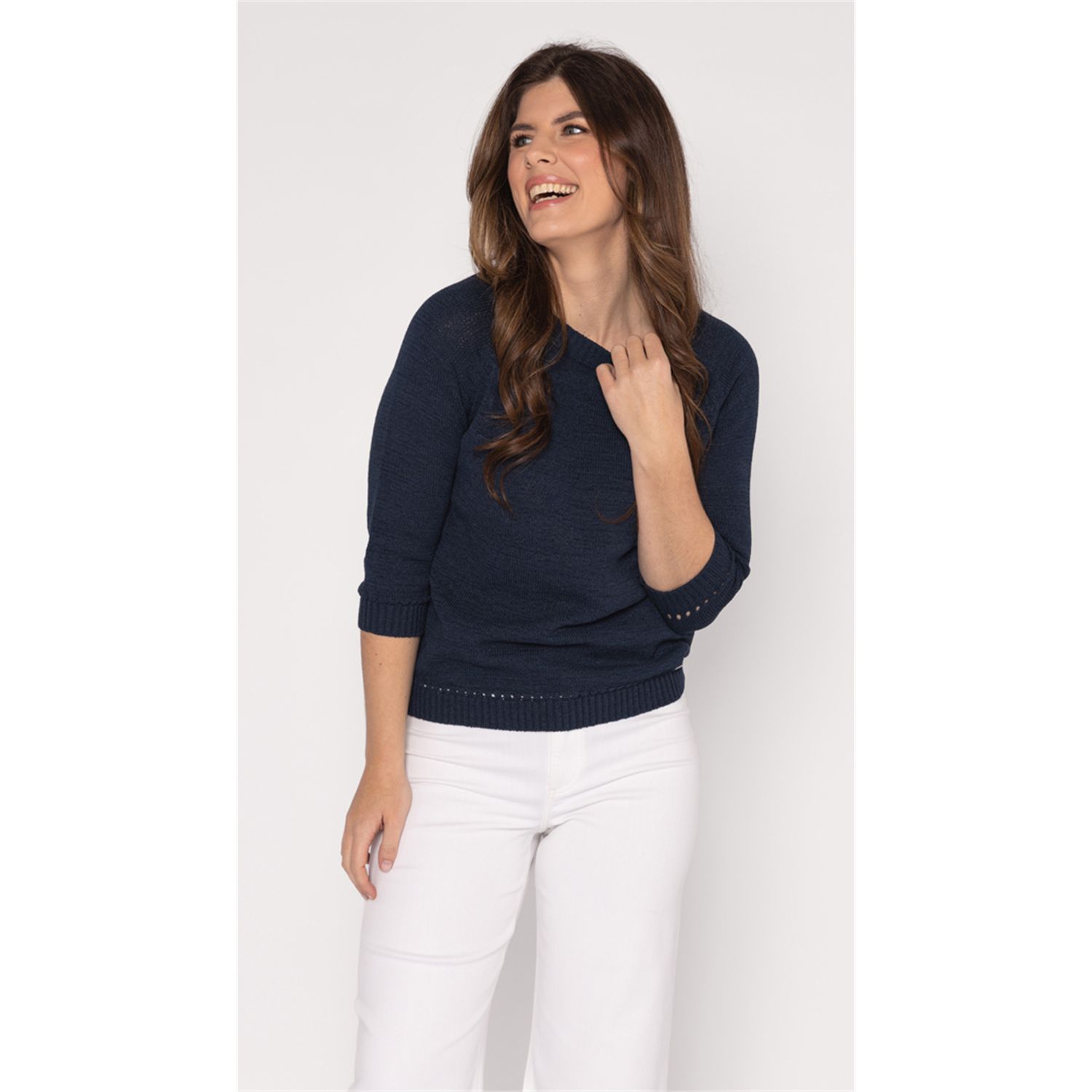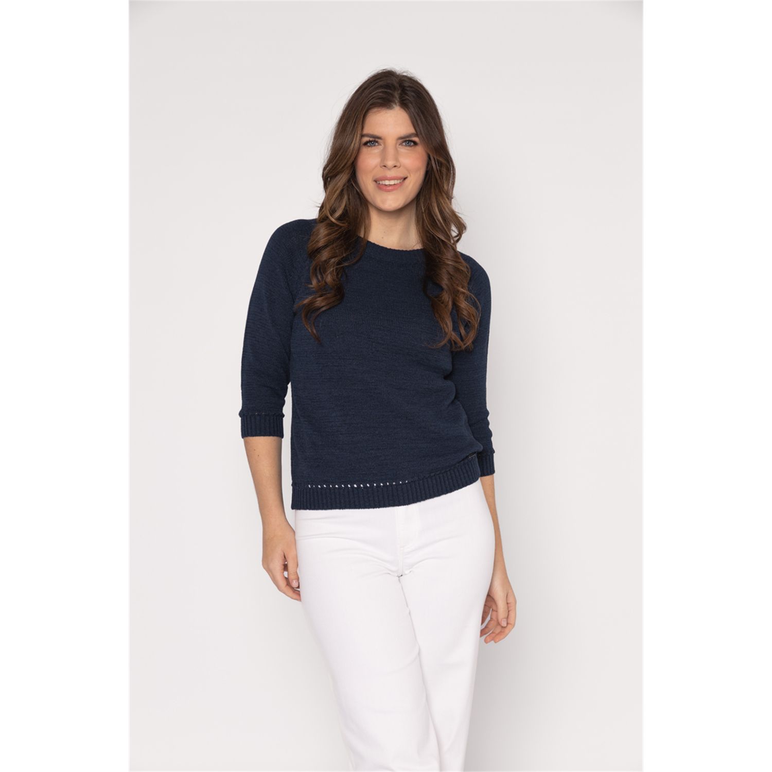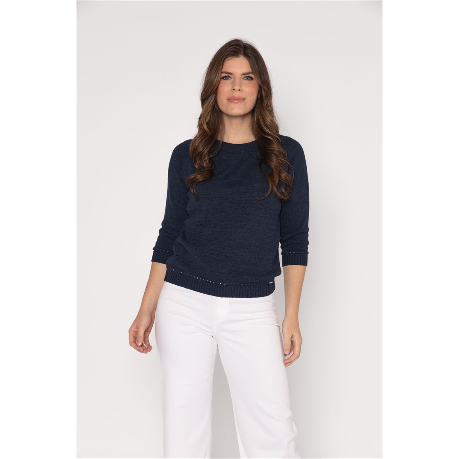 Pullover met driekwart mouwen in mooi bandjesgaren in katoenmix. Verkrijgbaar in diverse kleuren en 2 gestreepte kleur combinaties.