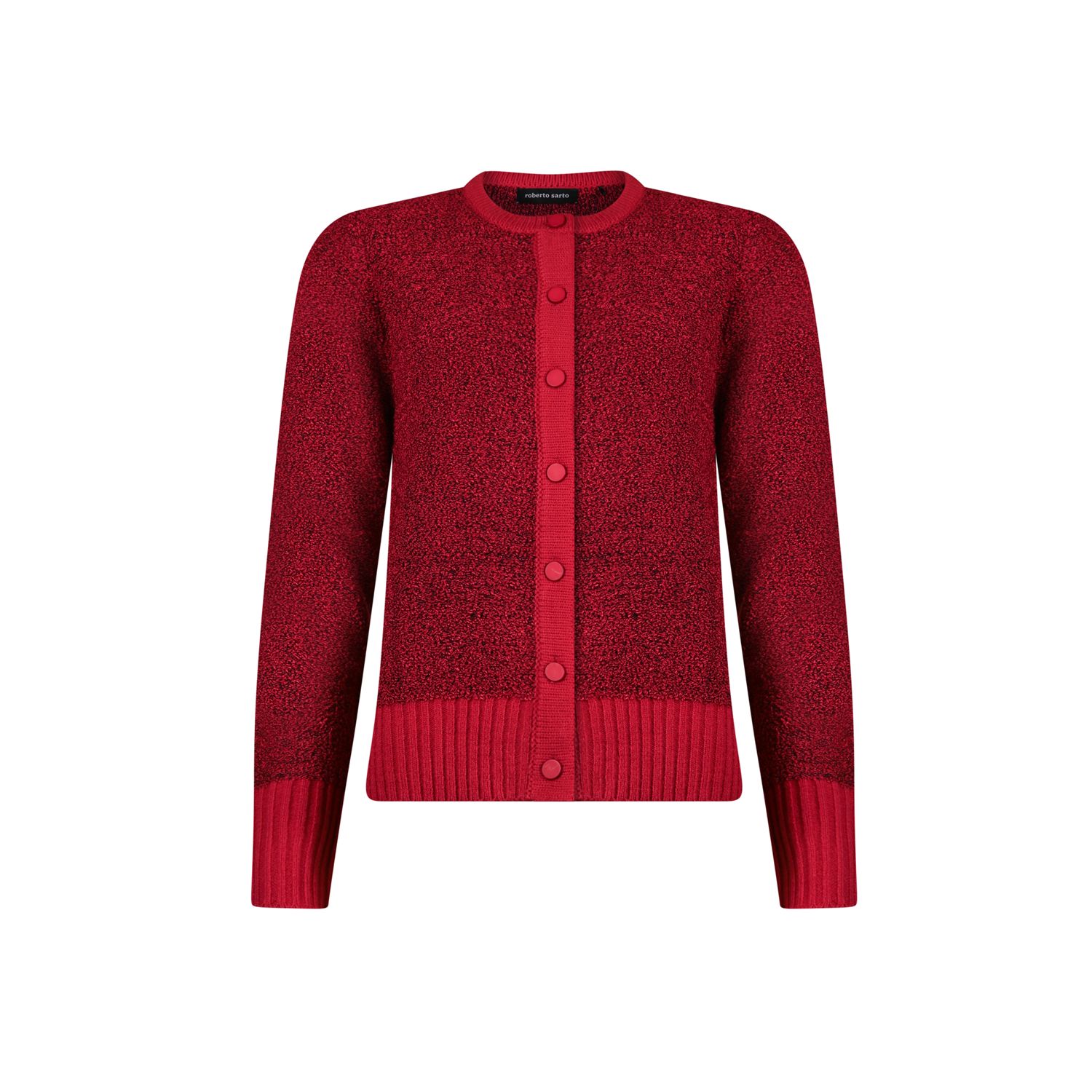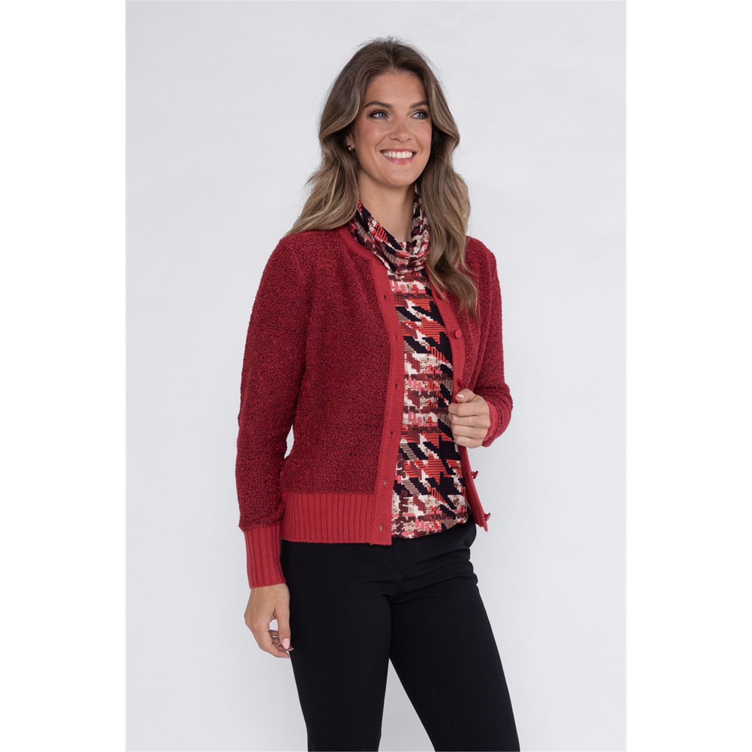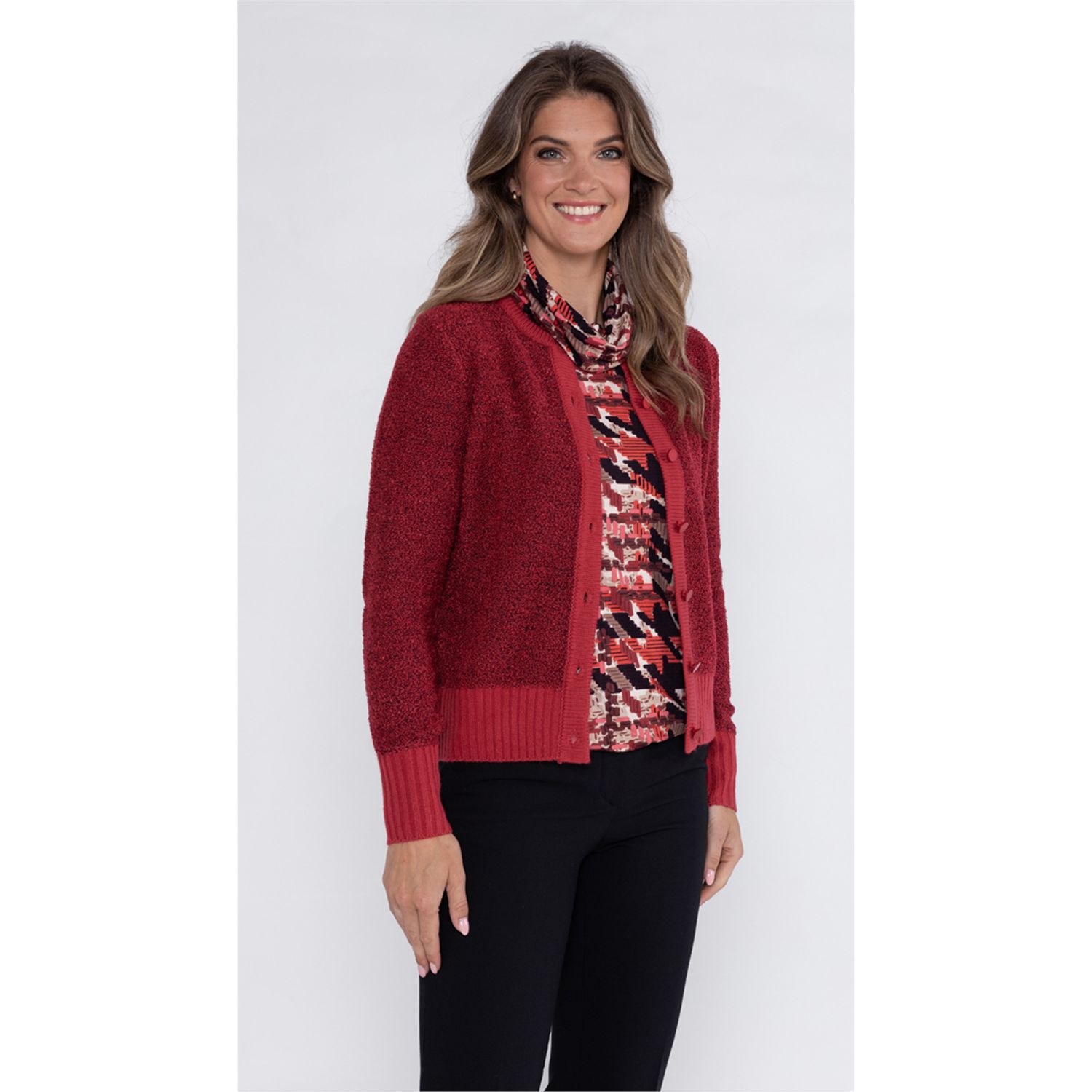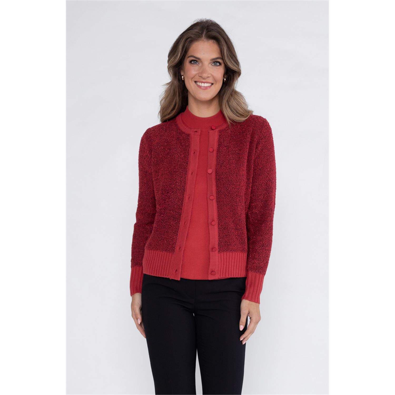 Vest in bouclé garen waarbij de hals en boorden gemaakt zijn van glad garen met ronde hals. Verkrijgbaar in meerdere kleuren.
