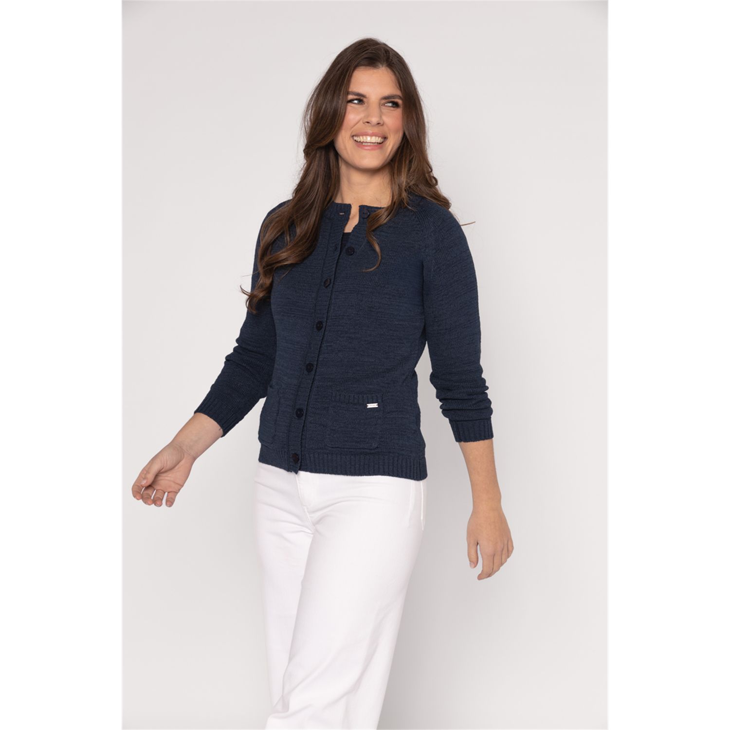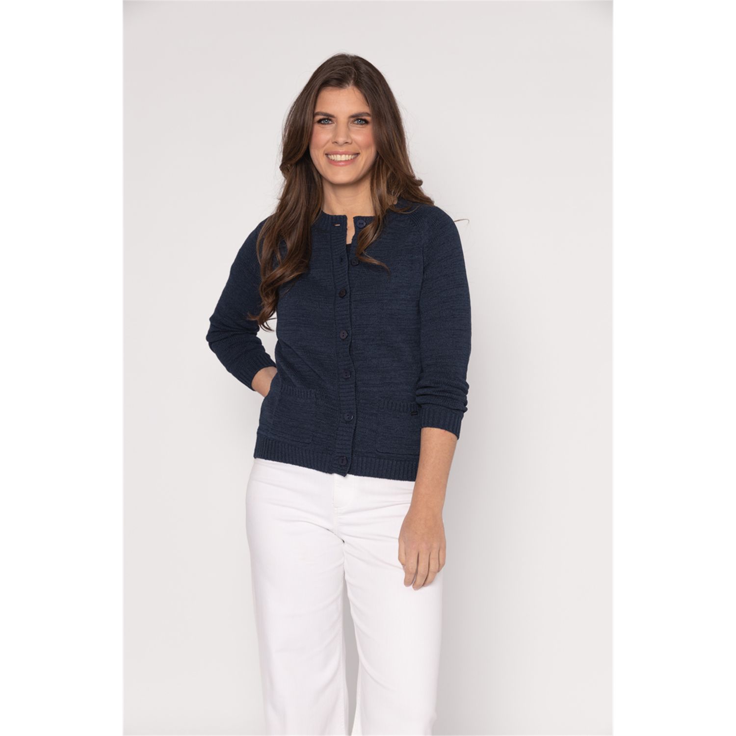 Vest met lange mouwen en zakjes in mooi bandjesgaren in katoenmix. Verkrijgbaar in diverse kleuren en 2 gestreepte kleur combinaties.