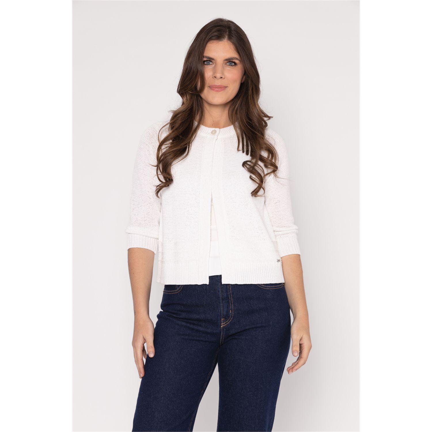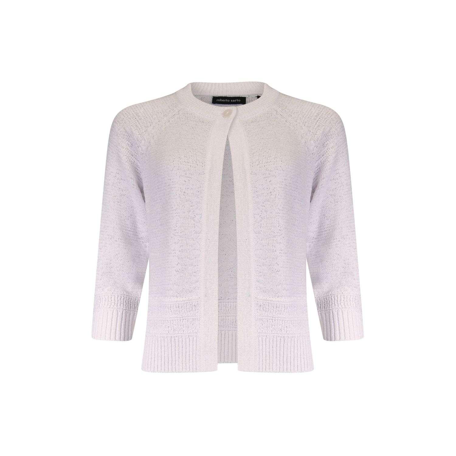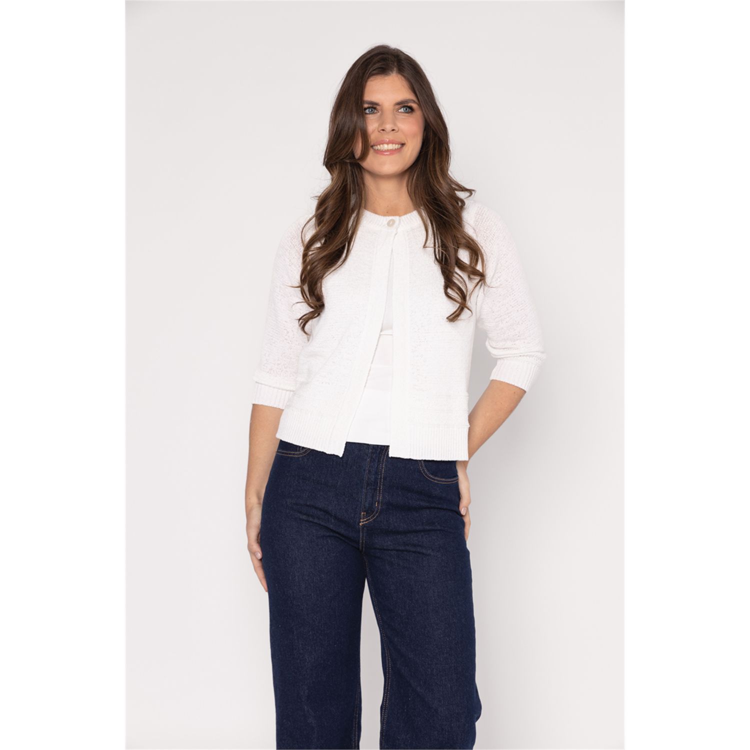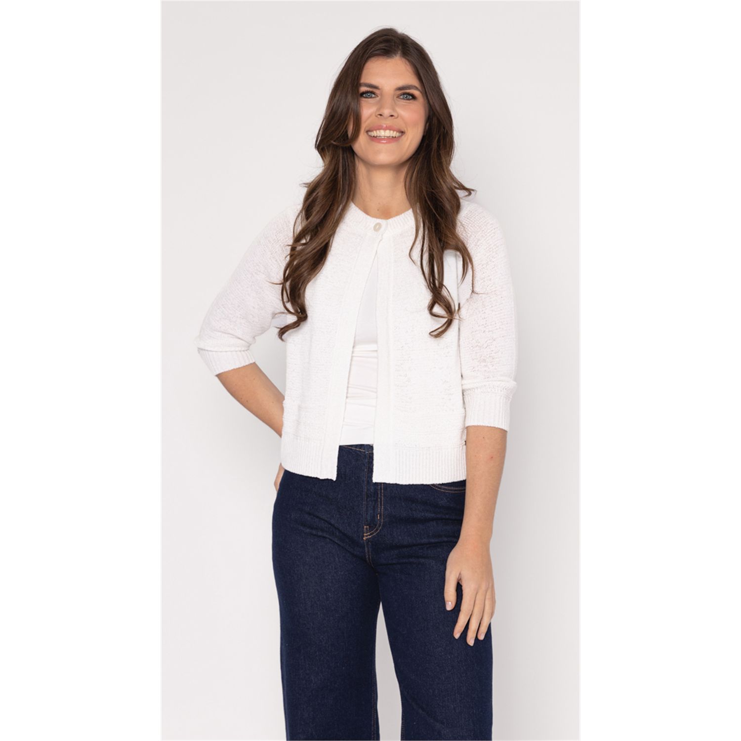 Kort O hals vestje in bandjesgaren met een driekwart mouw met fancy steek aan boorden. Sluit met een knoop. Verkrijgbaar in meerdere actuele kleuren.