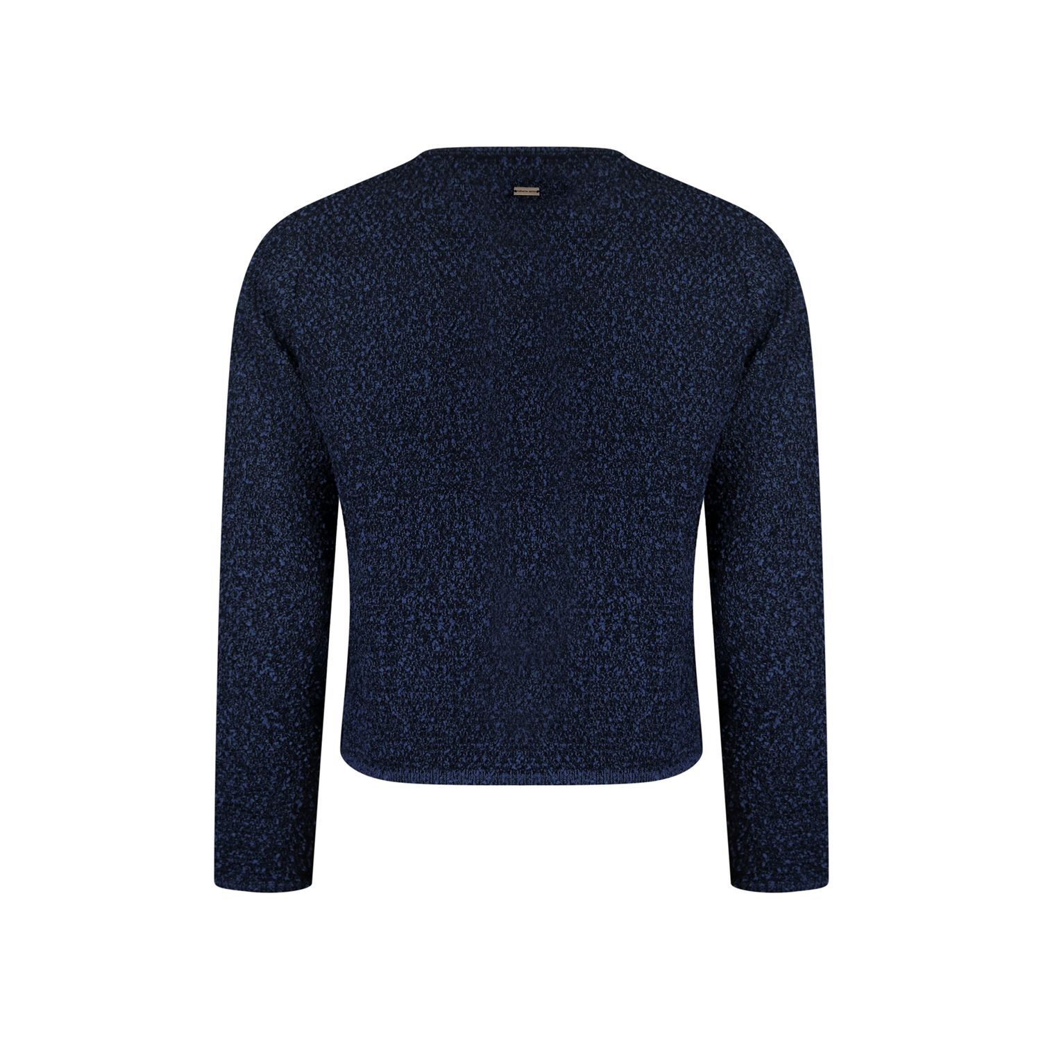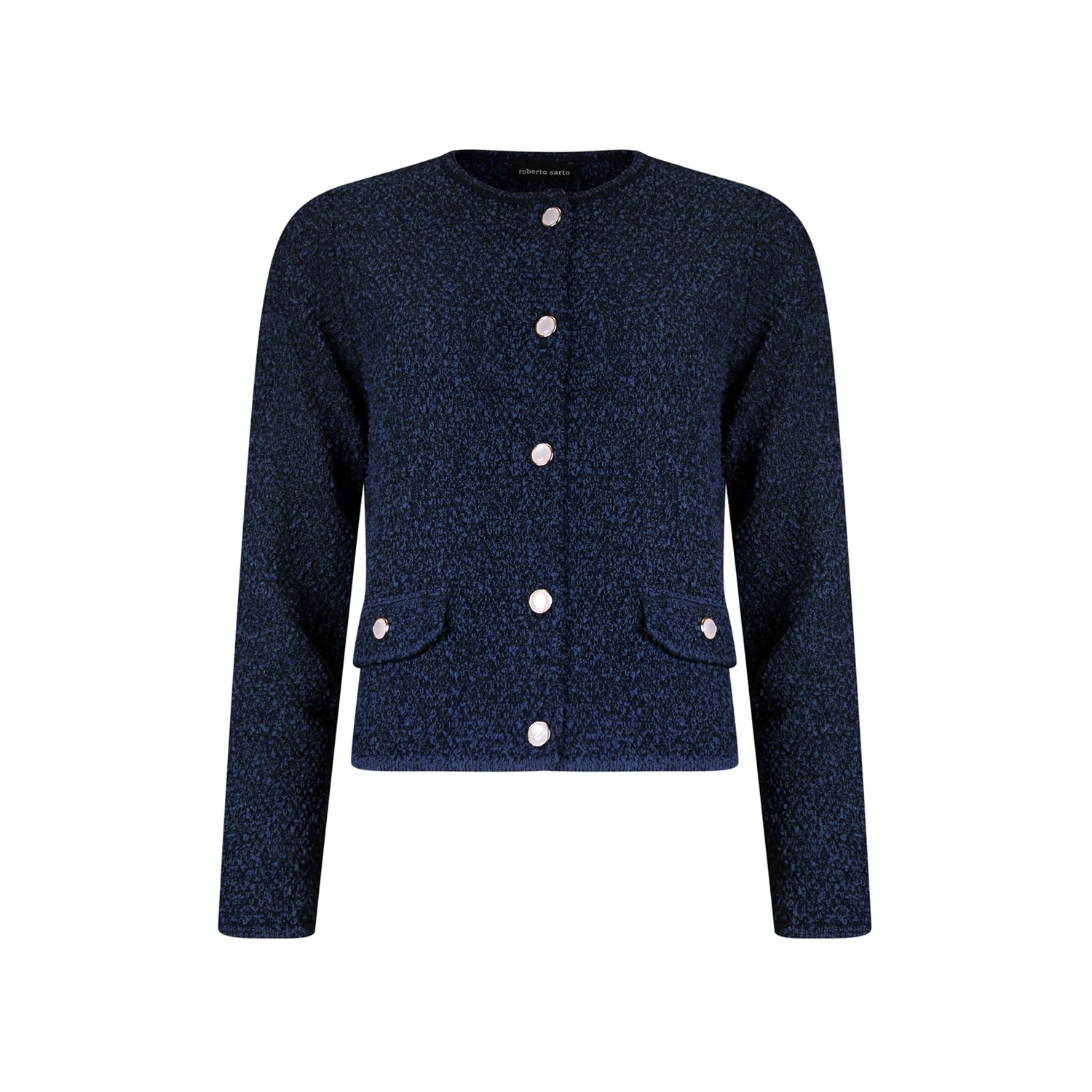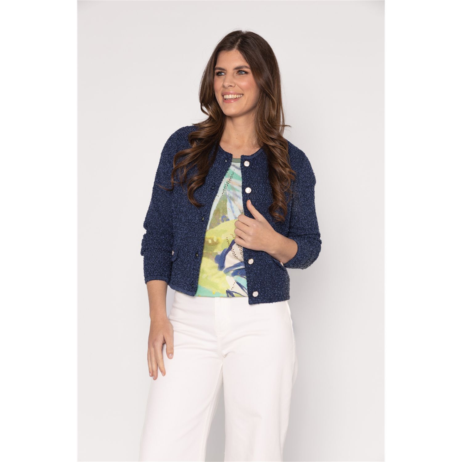 O hals vestje in mooie frisse zomerse bouclé mix met knoop sluiting en fake zakjes met knoop.