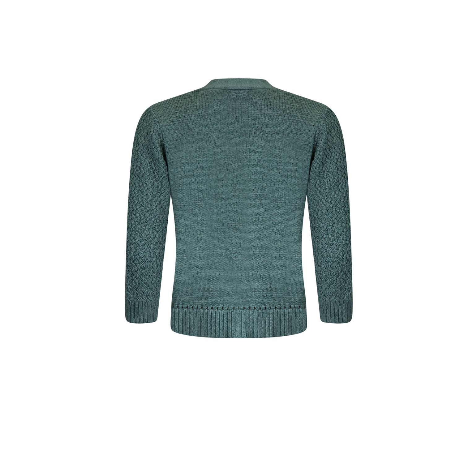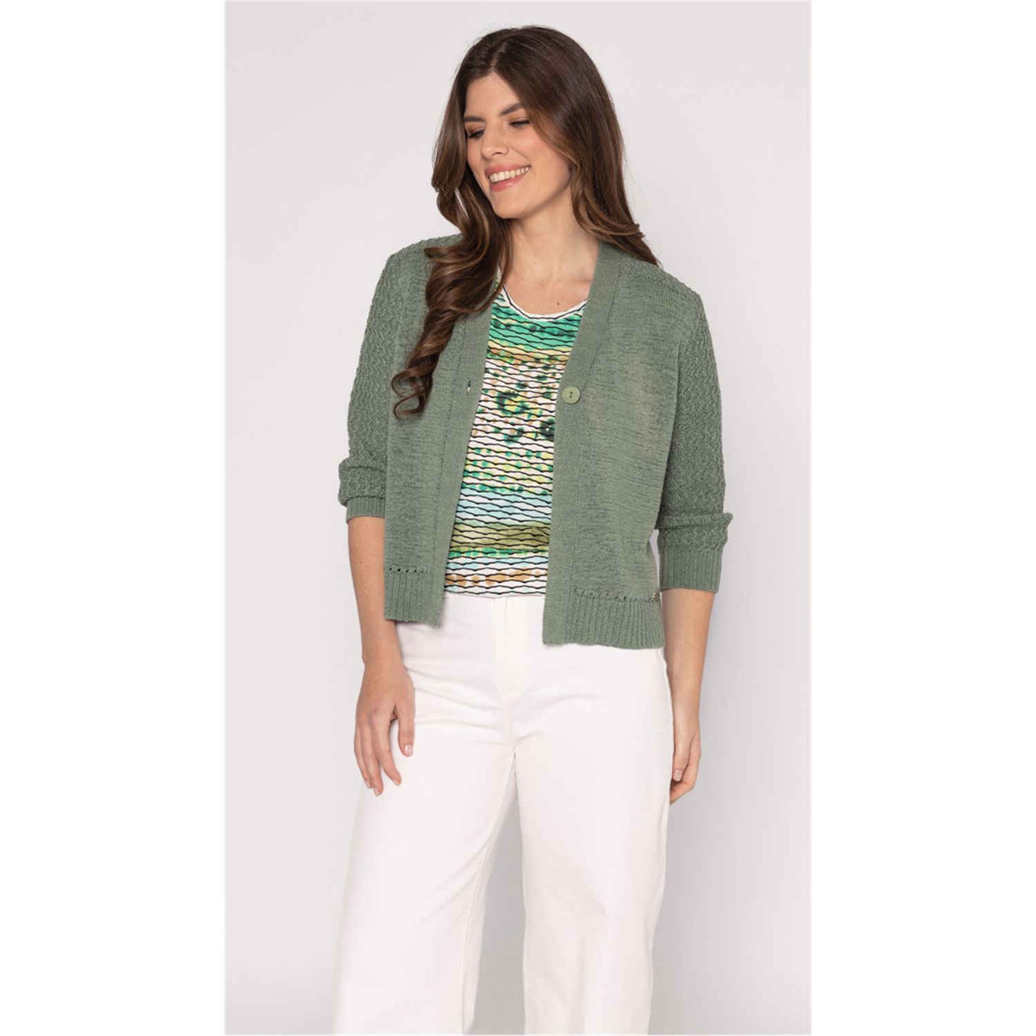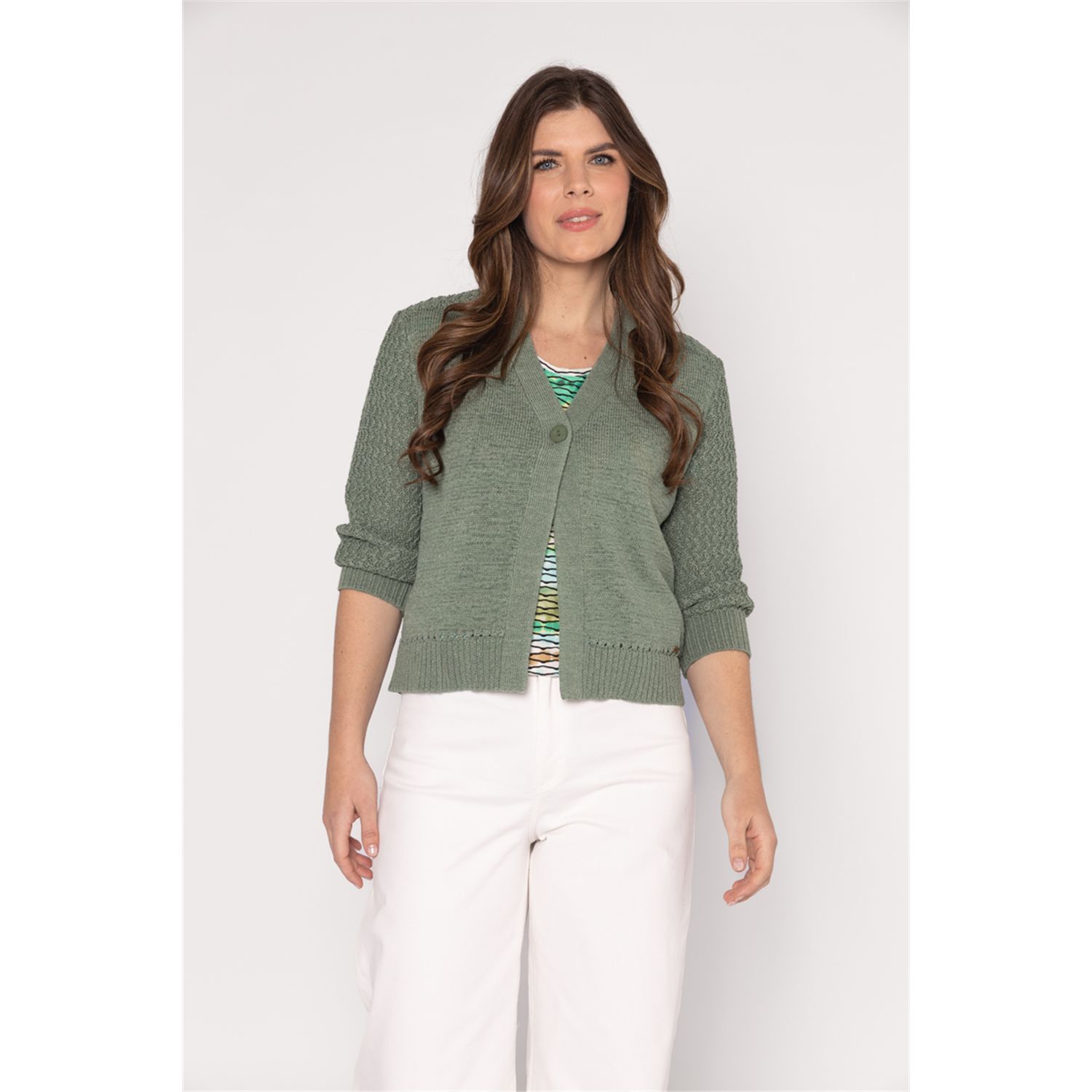 Kort bestseller vestje in bandjesgaren met een driekwart mouw in fancy steek. Sluit met een knoop. Verkrijgbaar in meerdere actuele kleuren.