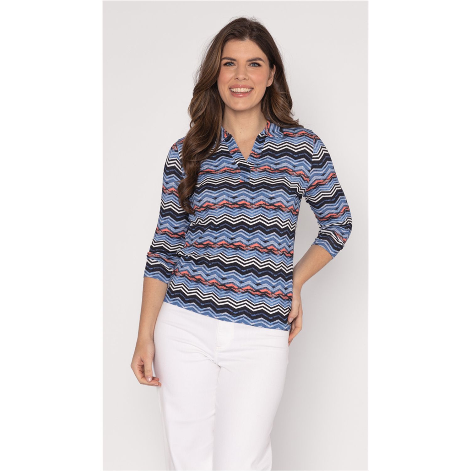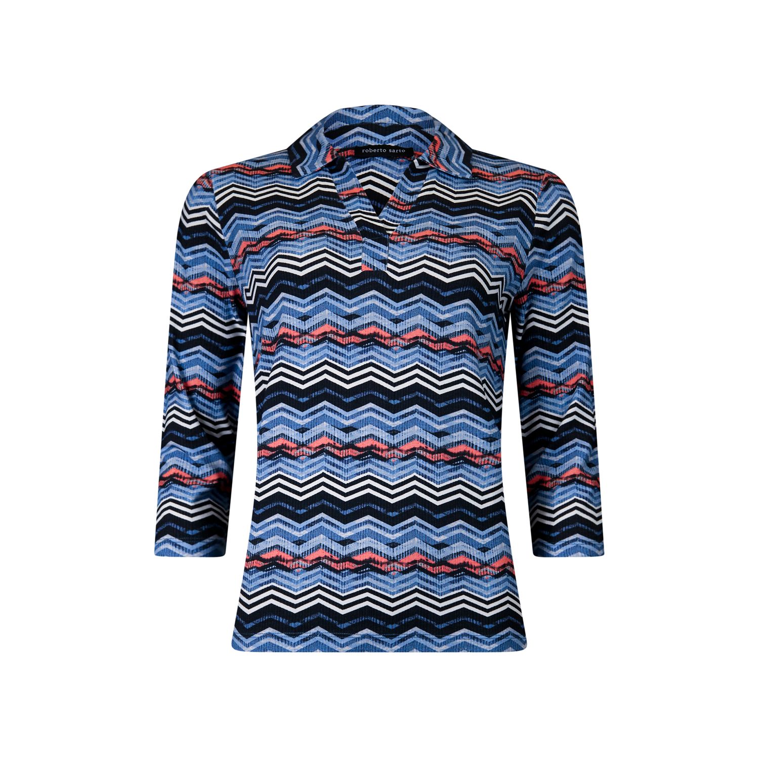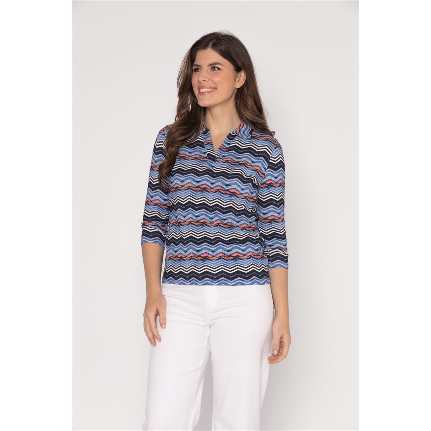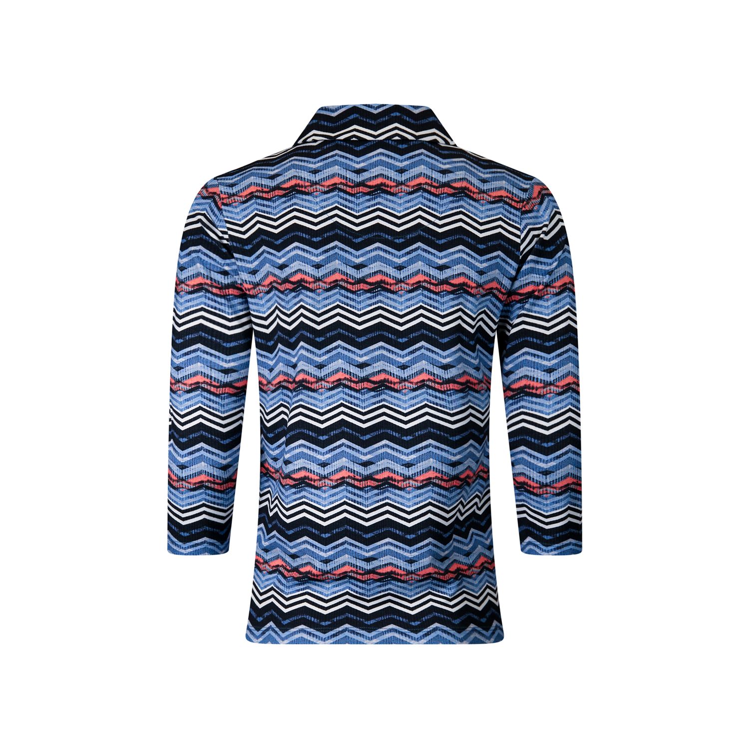 Licht getailleerd, losvallend poloshirt met driekwartmouwen. Dit luxe poloshirt is verkrijgbaar in diverse trendy prints.