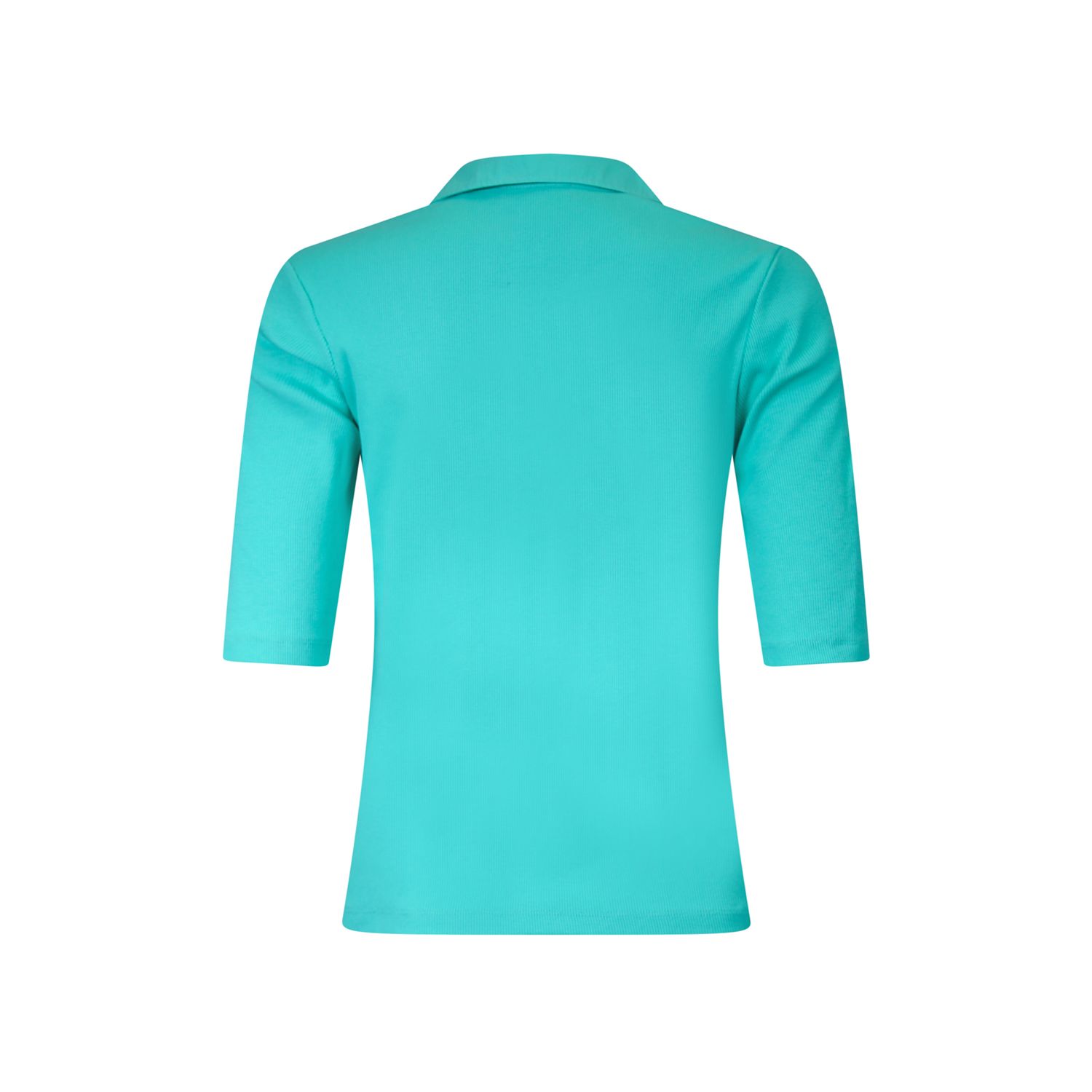 Poloshirt in een zachte comfortabele katoen-elasthan ribkwaliteit met matching geweven details. T-shirt heeft een lange korte mouw met omslag gesloten met een lus en klein knoopje.