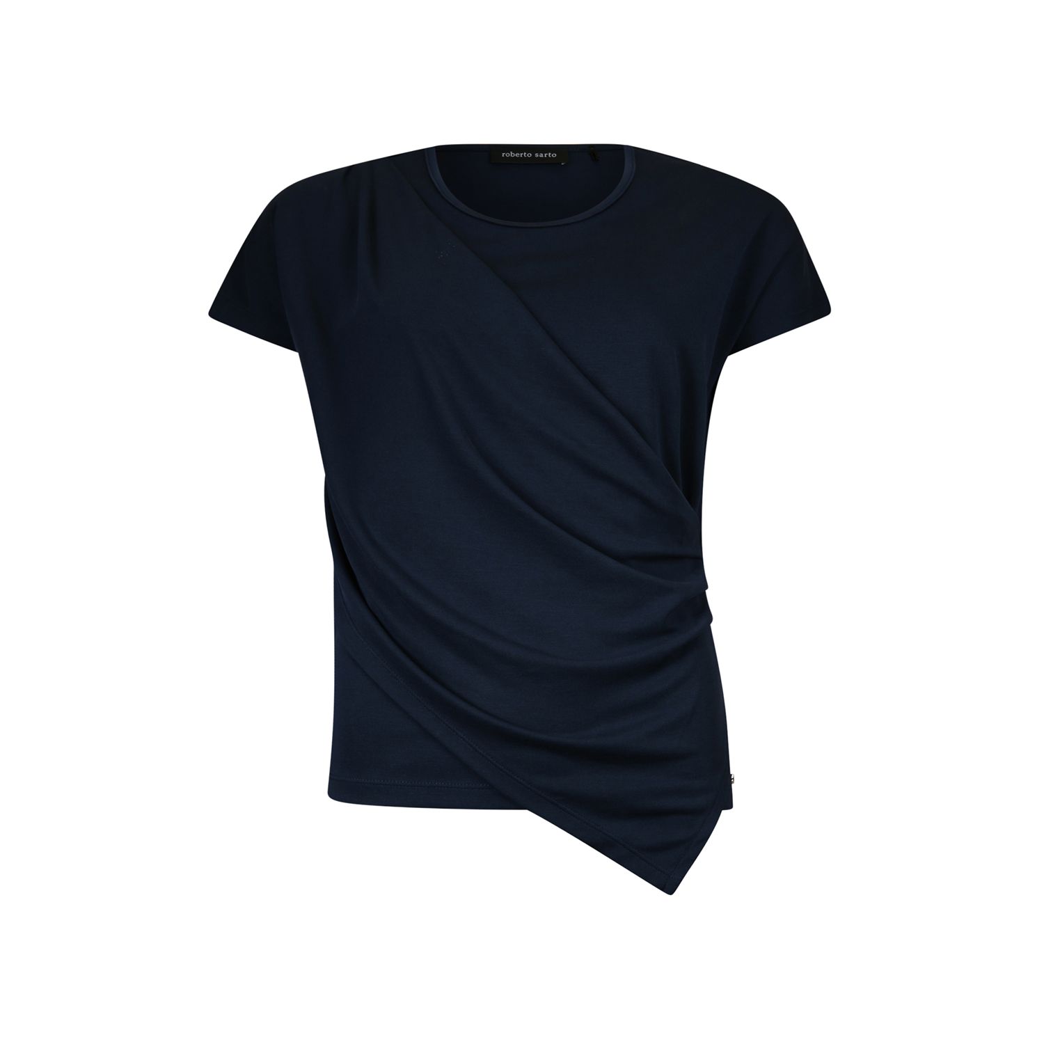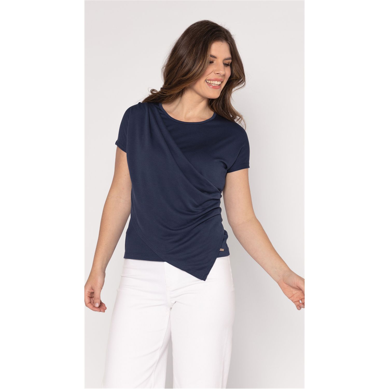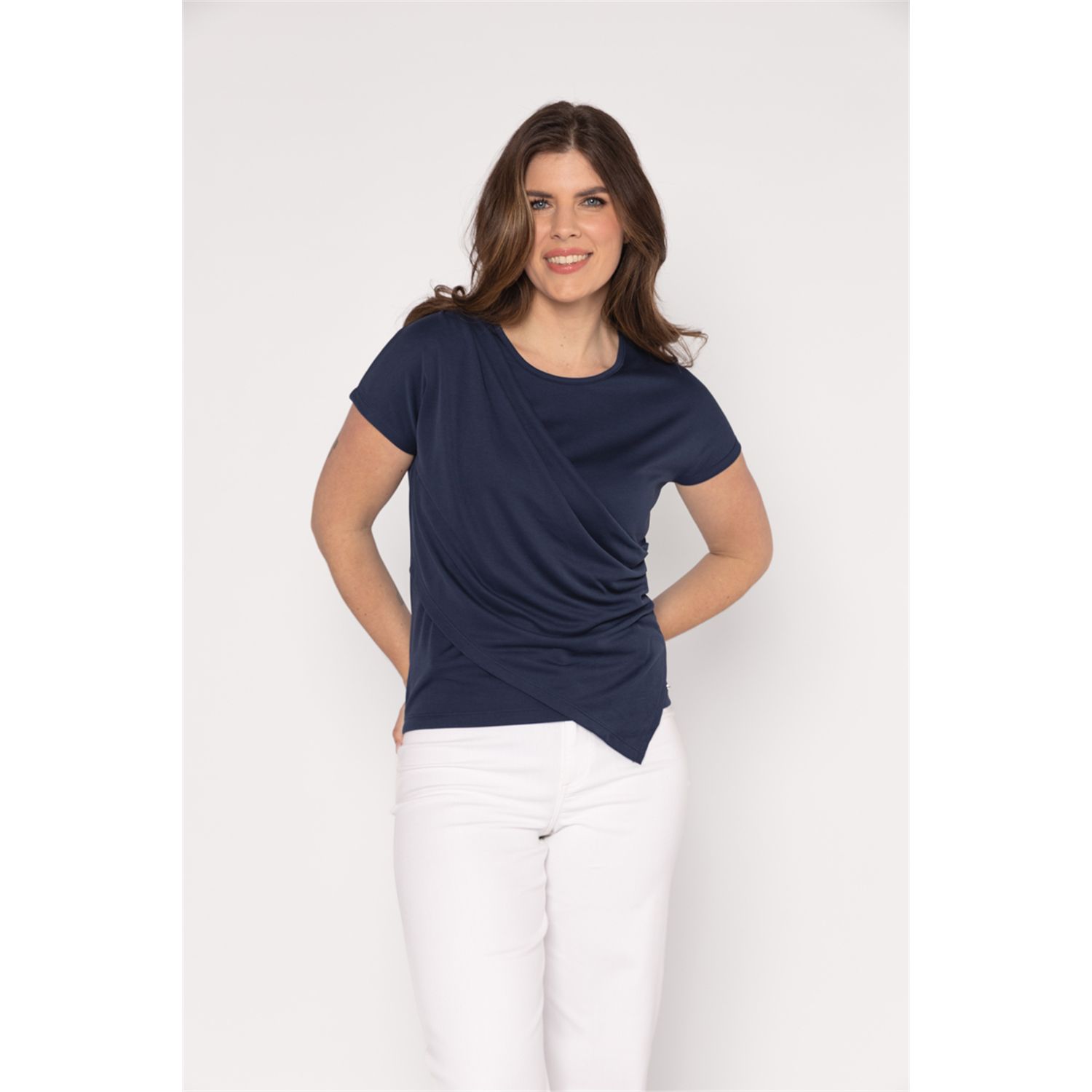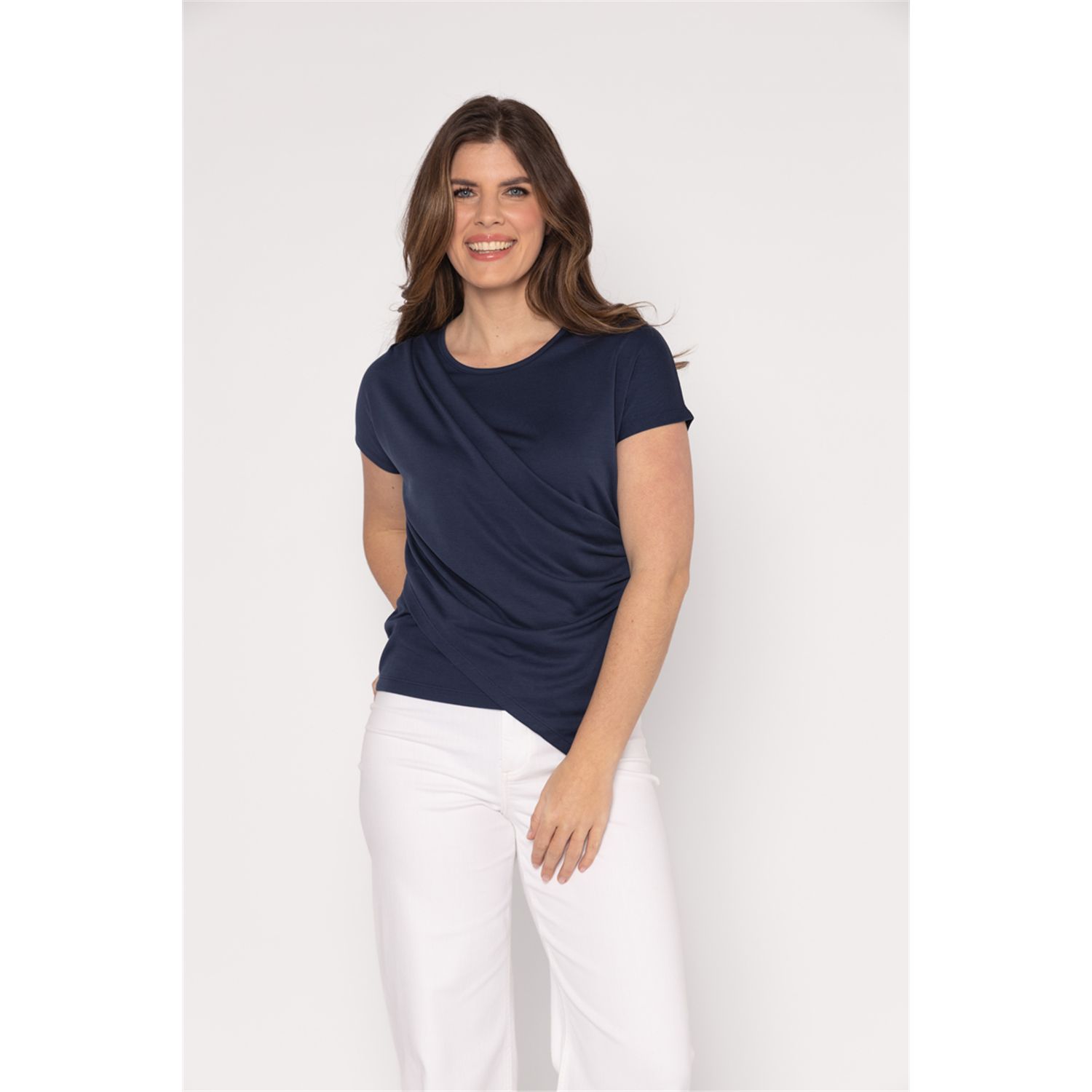 T-shirt ronde hals in een modal-mix kwaliteit met een mooie dubbel gedrapeerde laag die mooi afkleed. Dit model is recht en sluit mooi aan op de heup.